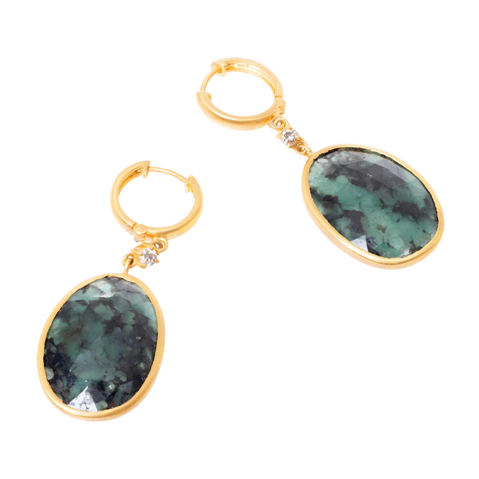 2 smaralde ovale checker-cut, culoare verde, claritate heavily included, cca. 13,0 ct. și 2 diamante rotunde briliant, culoare S-T, claritate VS2, cca. 0,10 ct.