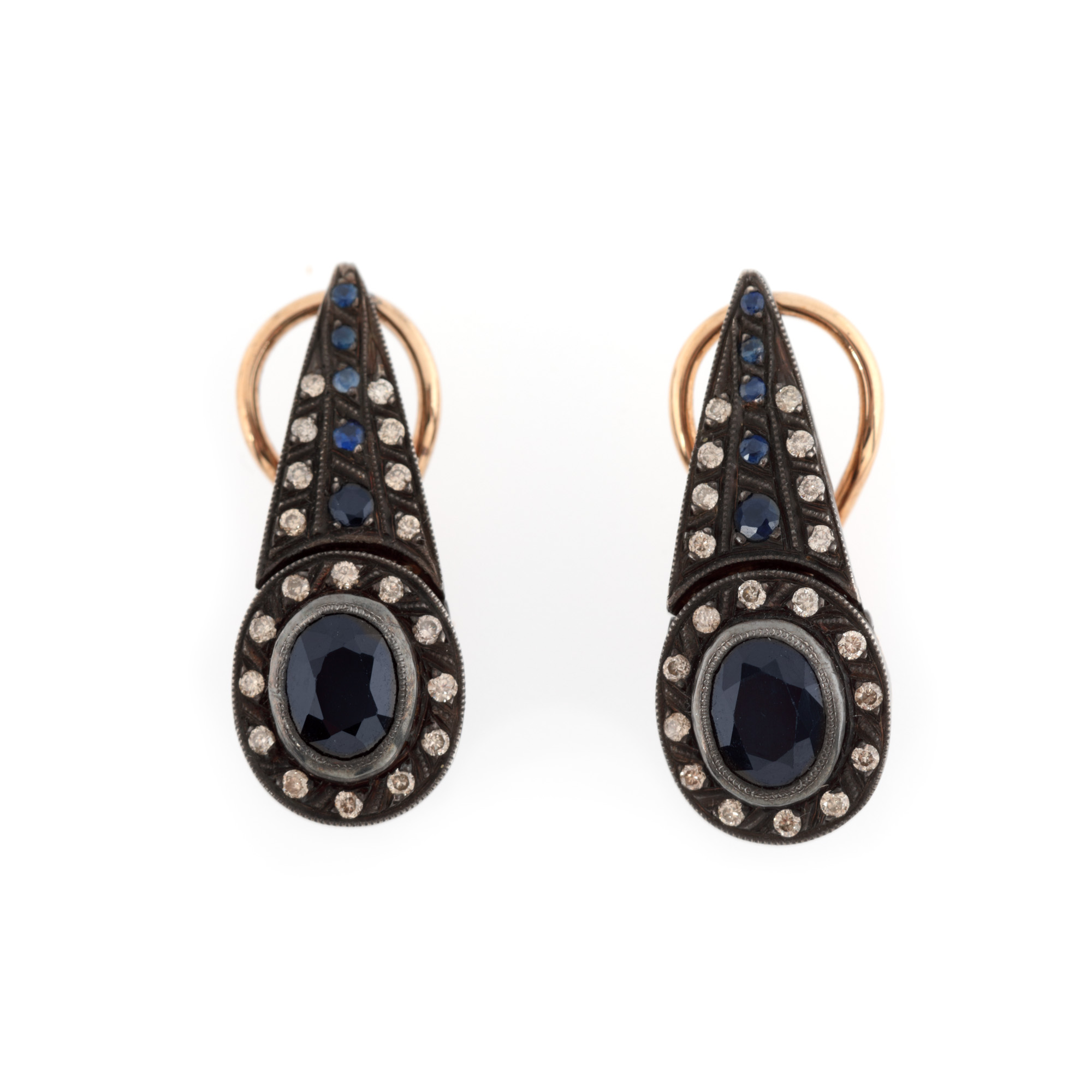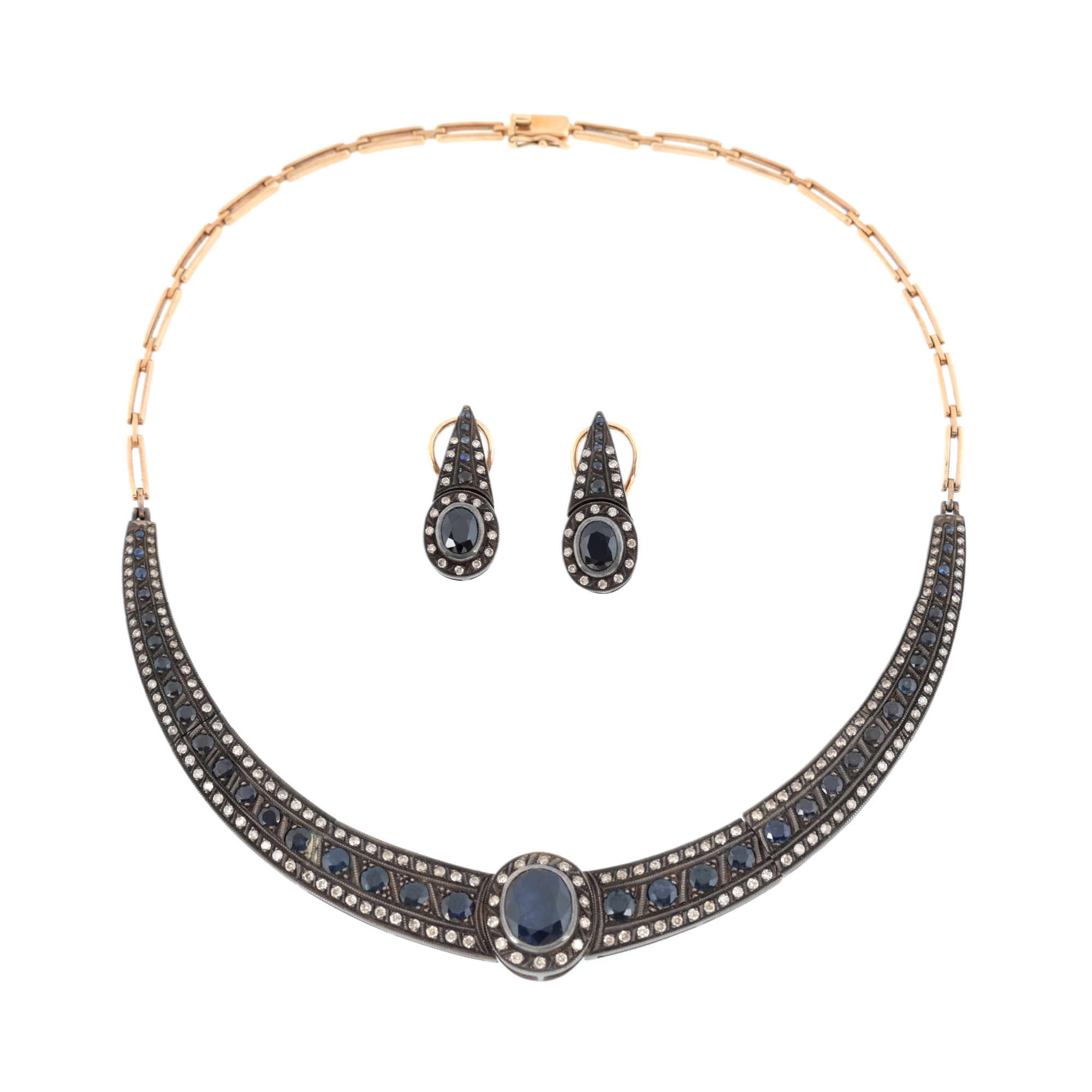 83. Demi-parure din aur roșu și argint, format din colier și pereche de cercei, decorat cu safire și diamante