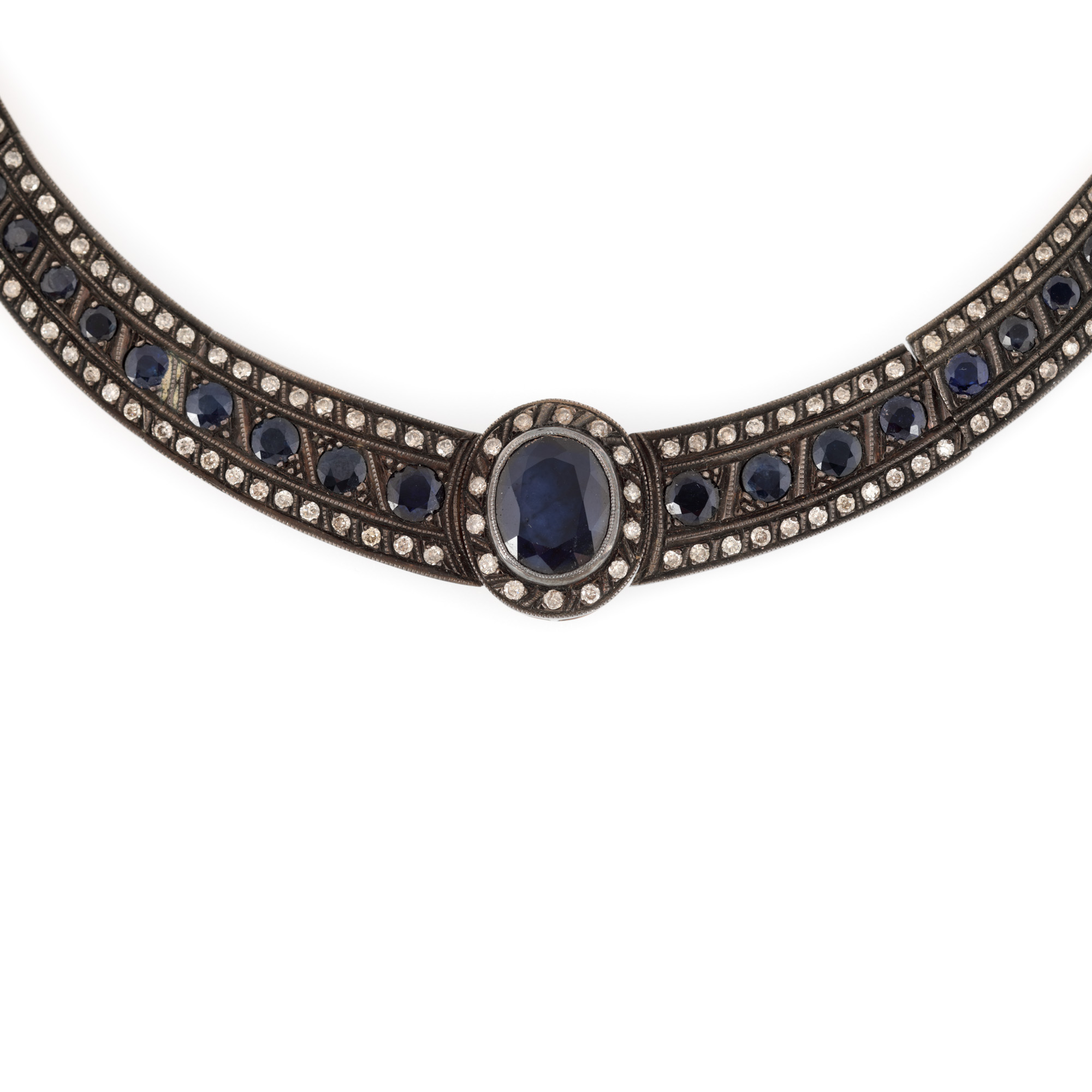 49 safire (3 oval fațetate, 46 rotund fațetate), culoare albastru, claritate moderately included, cca. 15,5 ct. și 202 diamante rotunde briliant, culoare R-T, clartate VS-SI1, cca. 2,9 ct.