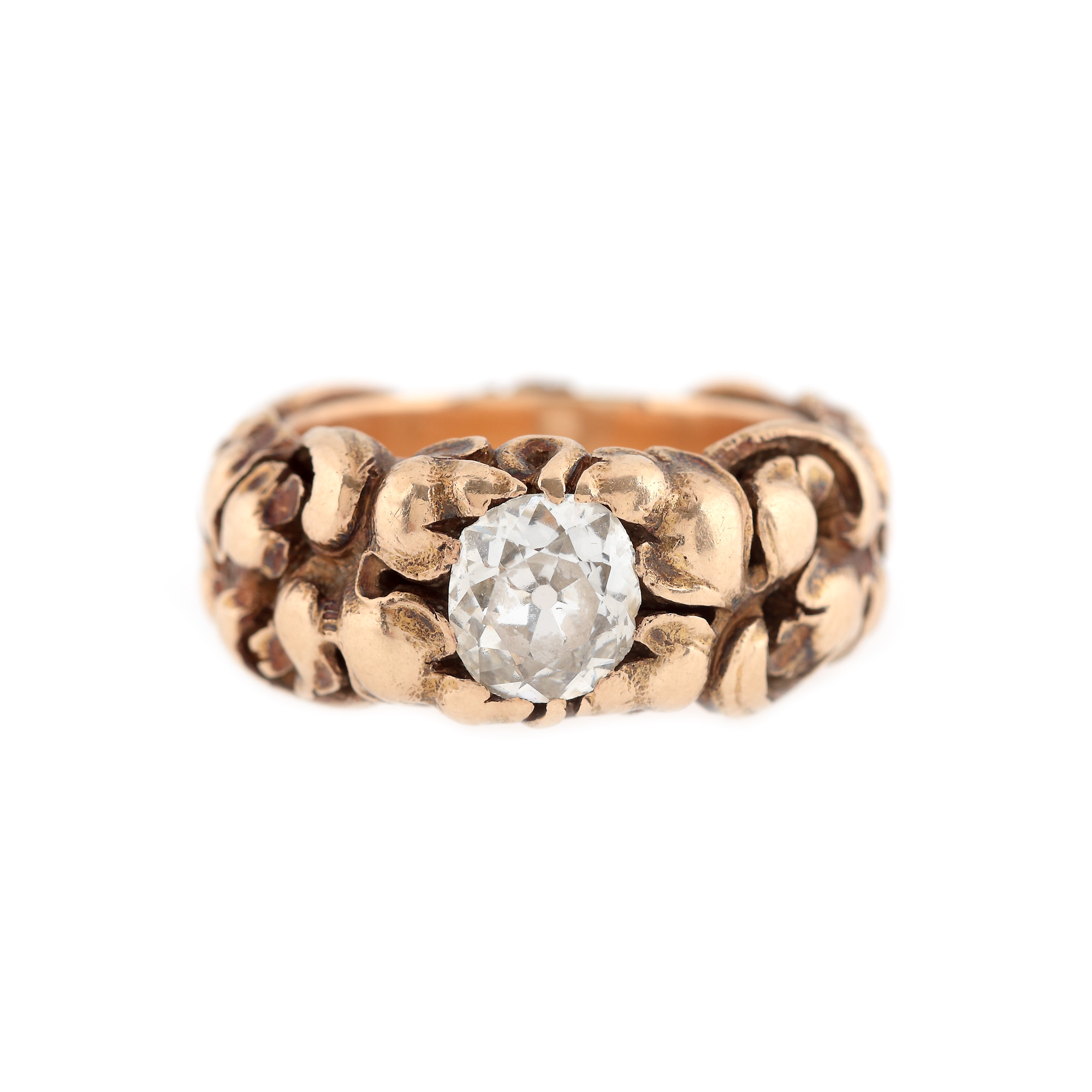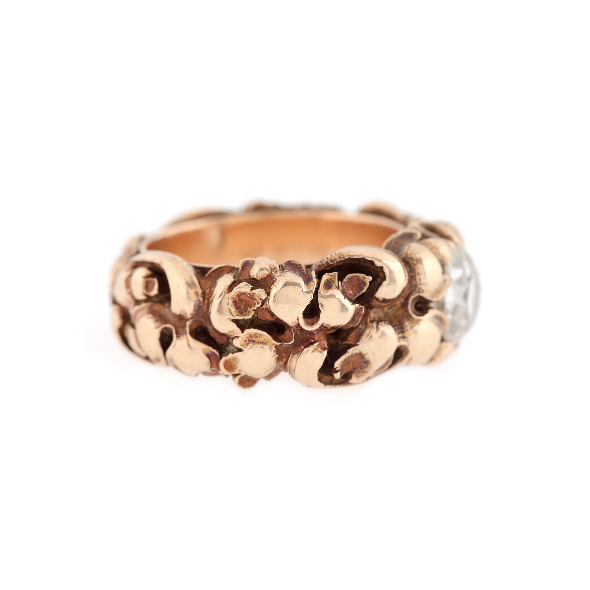 136. Inel Biedermeier din aur, decorat cu elemente vegetale stilizate și un diamant central