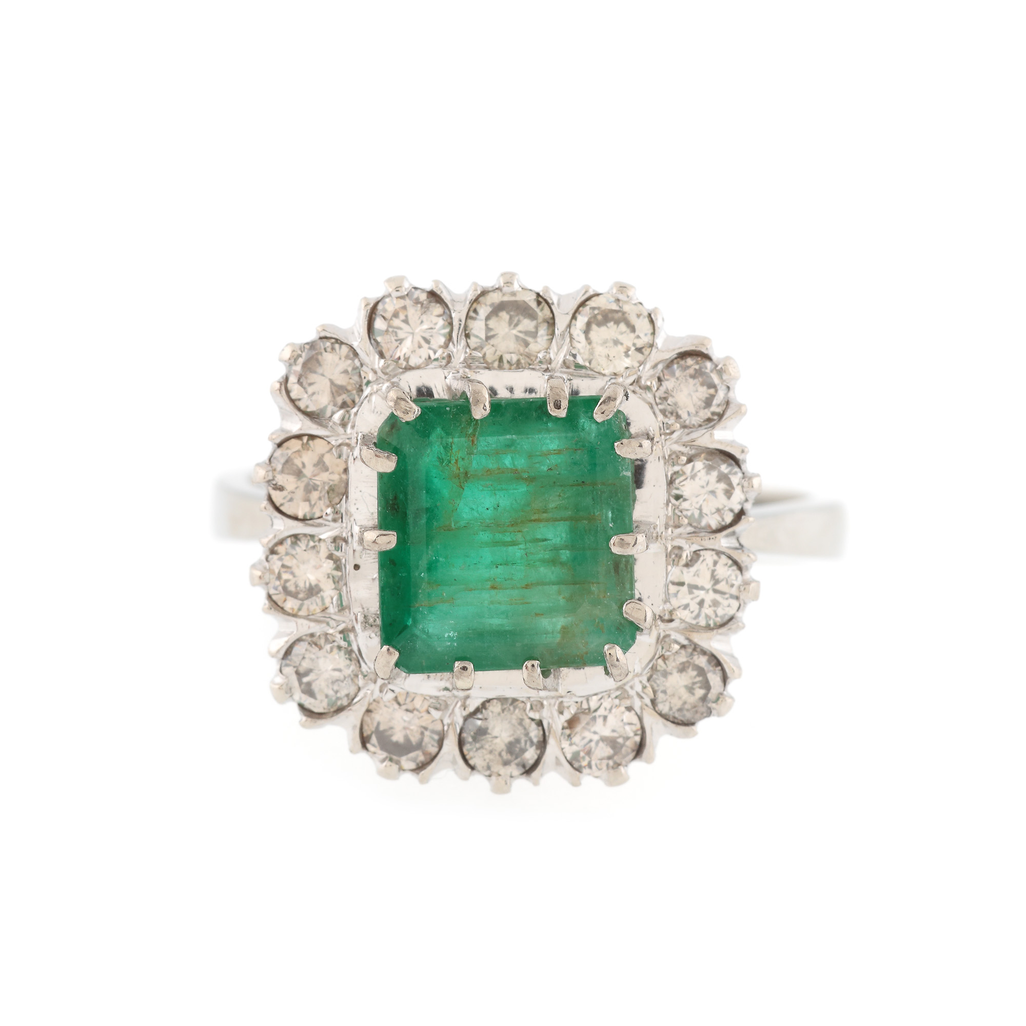 1 smarald pătrat step cut, culoare verde, claritate heavily included, cca. 1,82 ct. și 14 diamante rotunde briliant, culoare L-M, claritate SI-I1, cca. 0,84 ct.