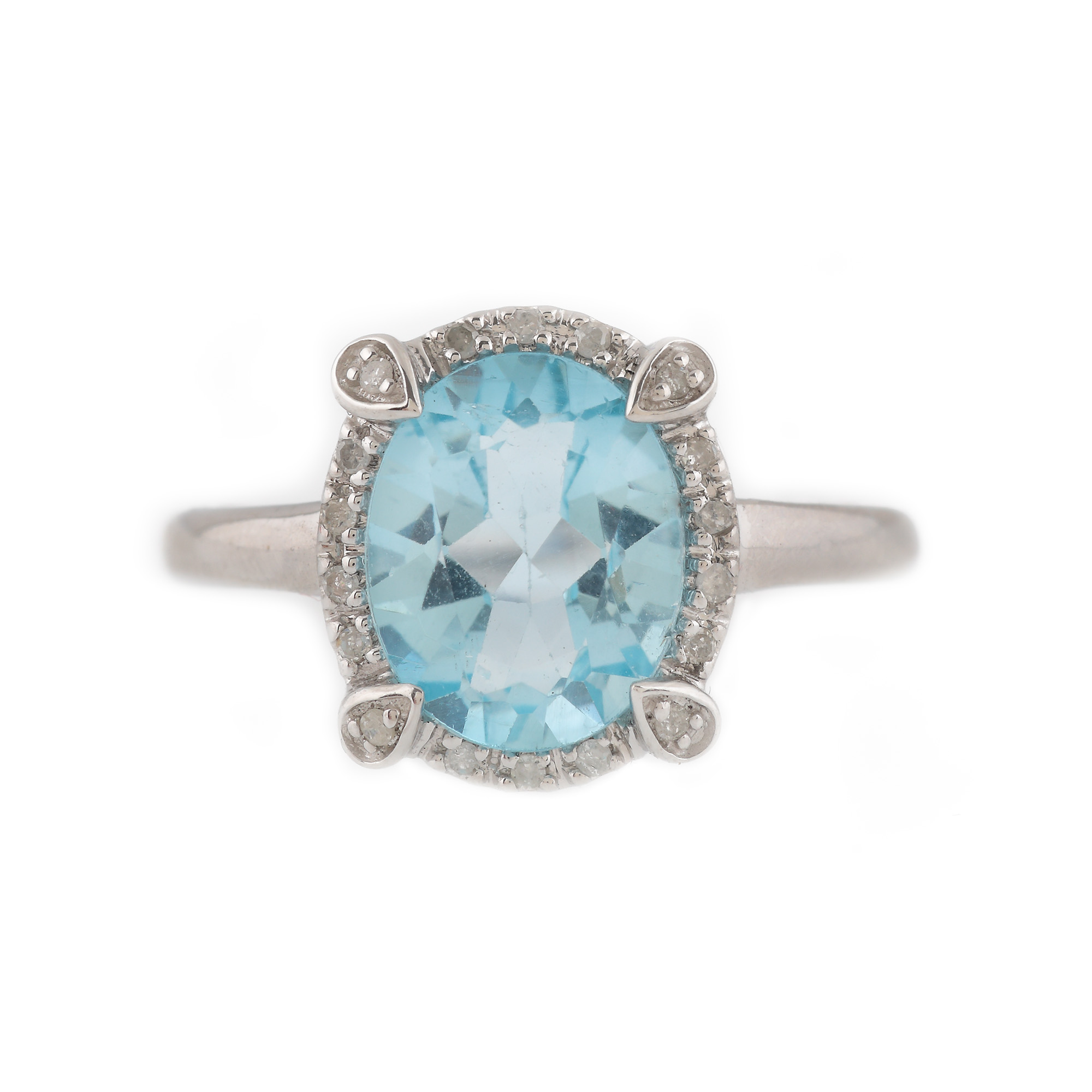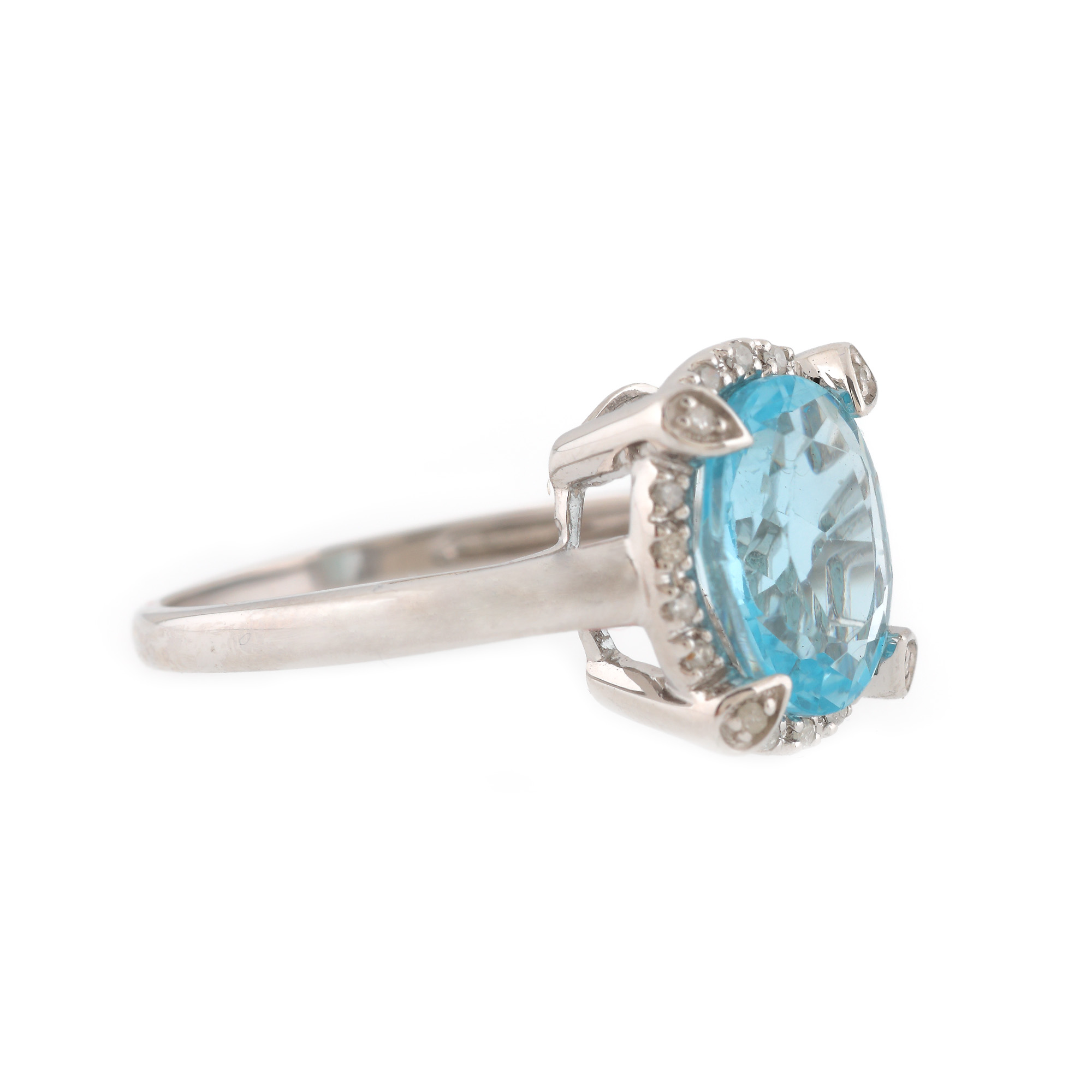 1 topaz oval fațetat, culoare bleu, claritate eye-clean, cca. 2,8 ct. și 18 diamante single cut, culoare H-I, claritate I2-I3, cca. 0,13 ct.
