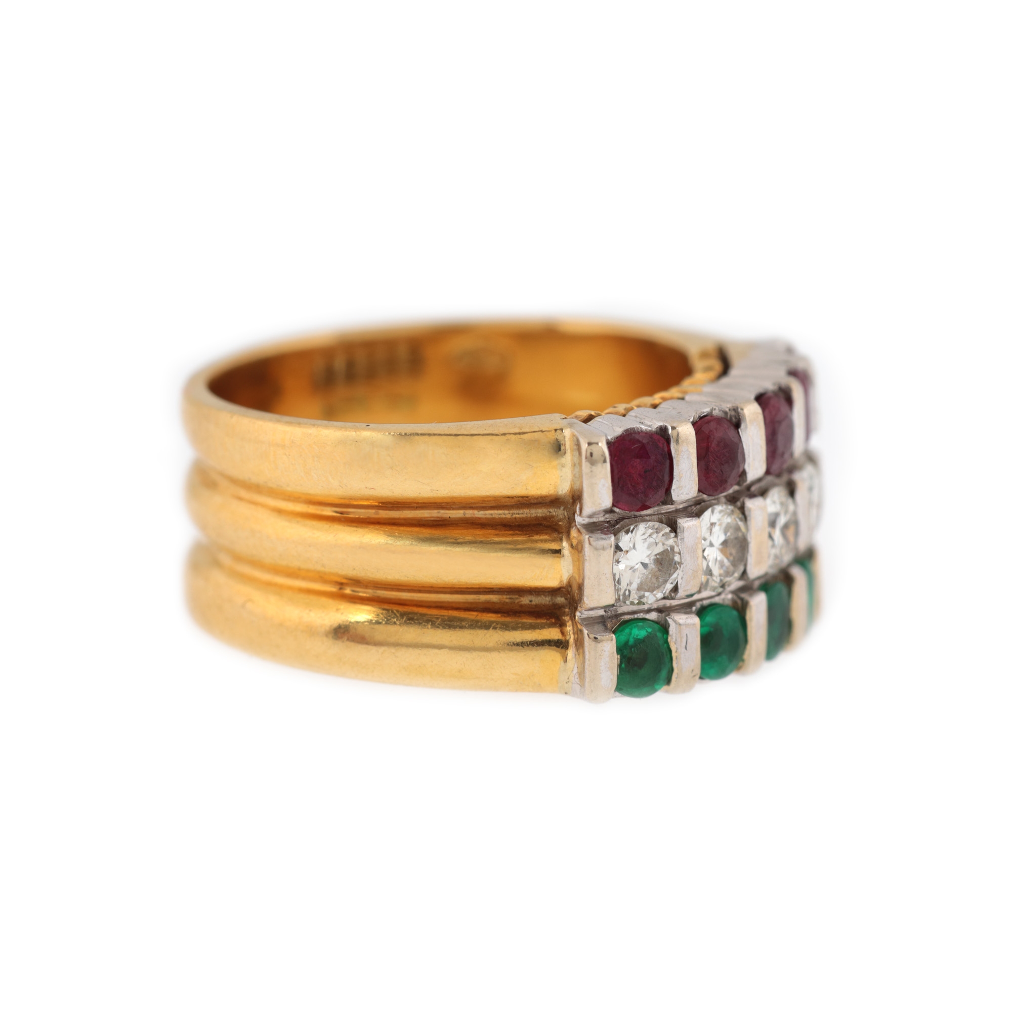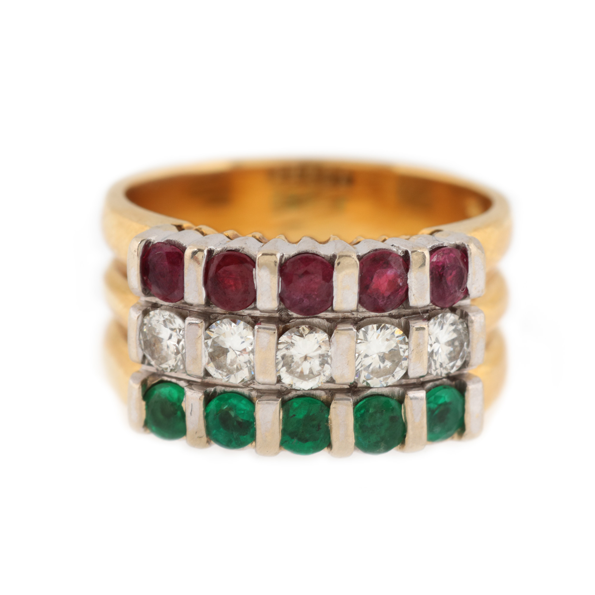 5 diamante rotunde briliant, culoare I-J, claritate VS-SI1, cca. 0,5 ct.; 5 rubine rotund fațetate, culoare roșu, claritate SI, cca. 0,48 ct. și 5 smaralde rotund fațetate, culoare verde, claritate SI, cca. 0,33 ct.
