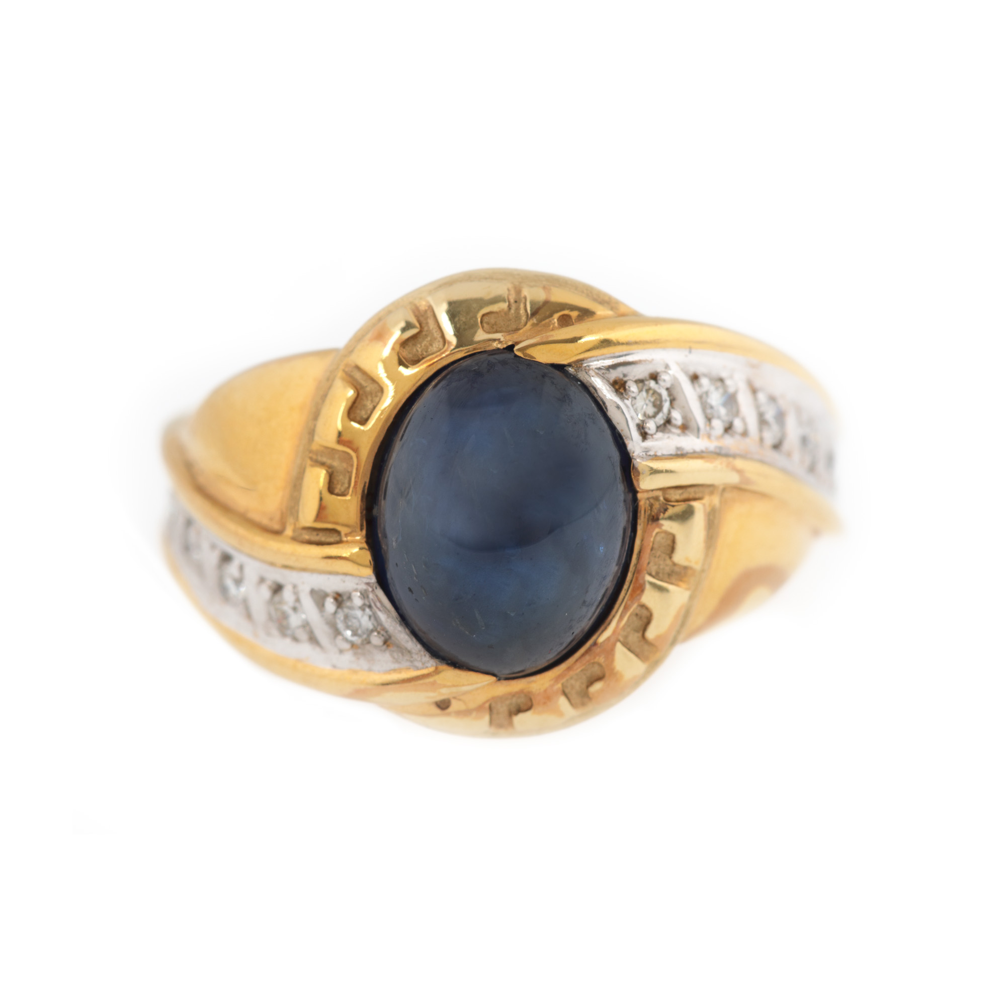 70. Inel din aur, decorat central cu safir caboșon și diamante