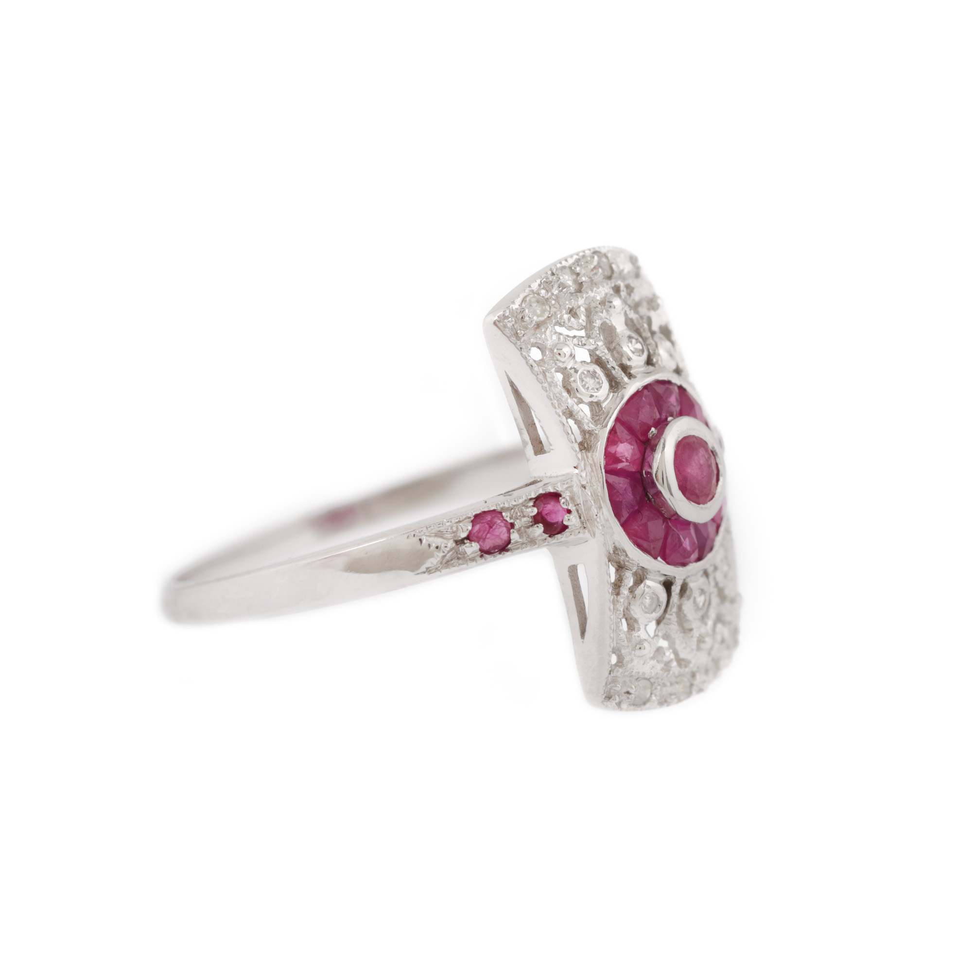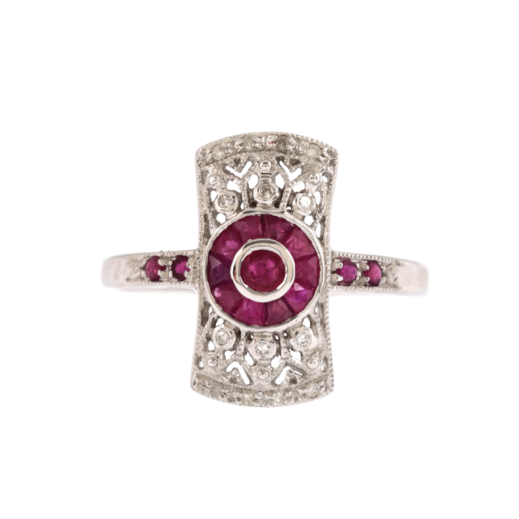 99. Inel în manieră Art Deco, din aur alb, decorat cu rubine și diamante