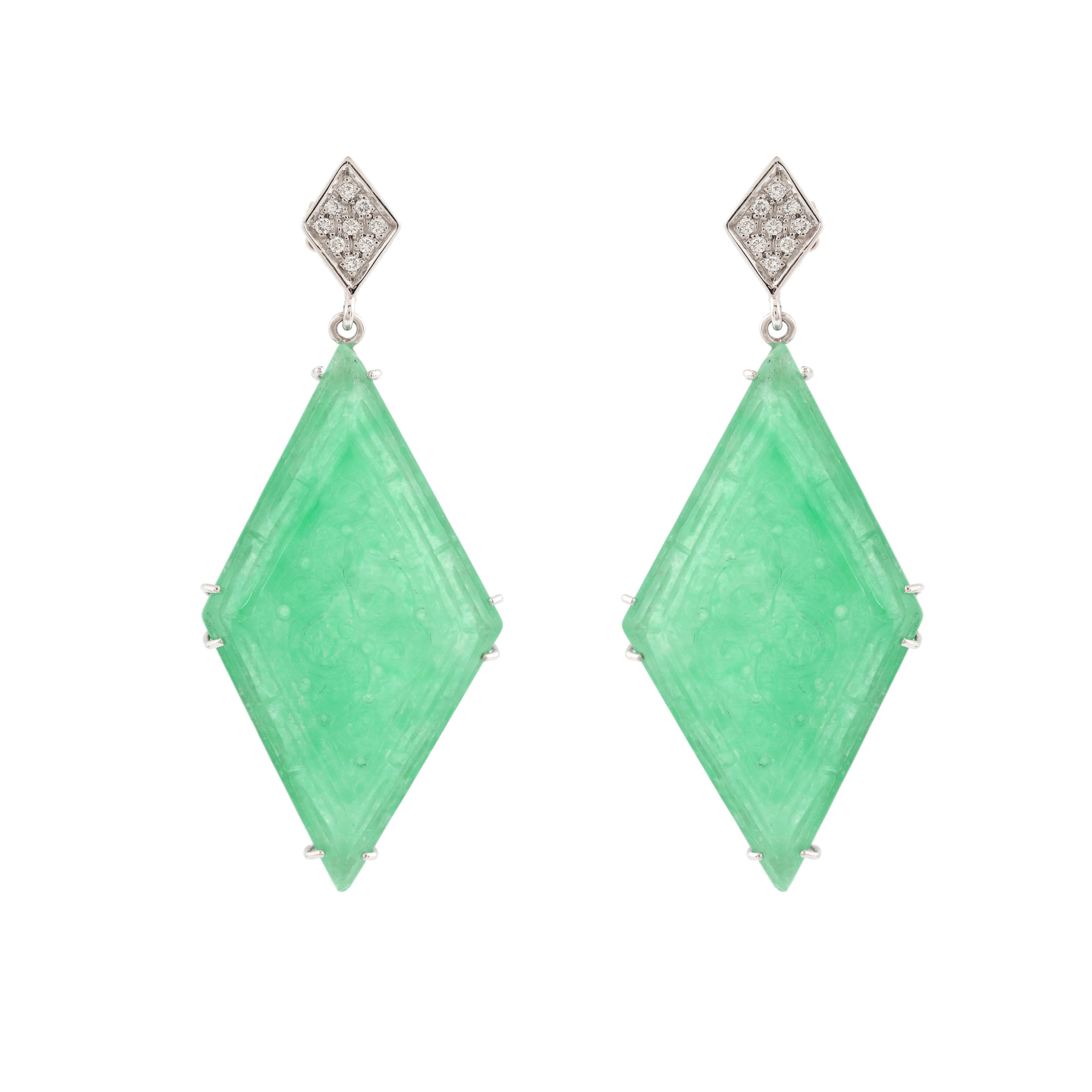 75. Pereche de cercei din aur alb, decorată cu jadeit sculptat în model floral stilizat și diamante, provine din colecția unui industriaș