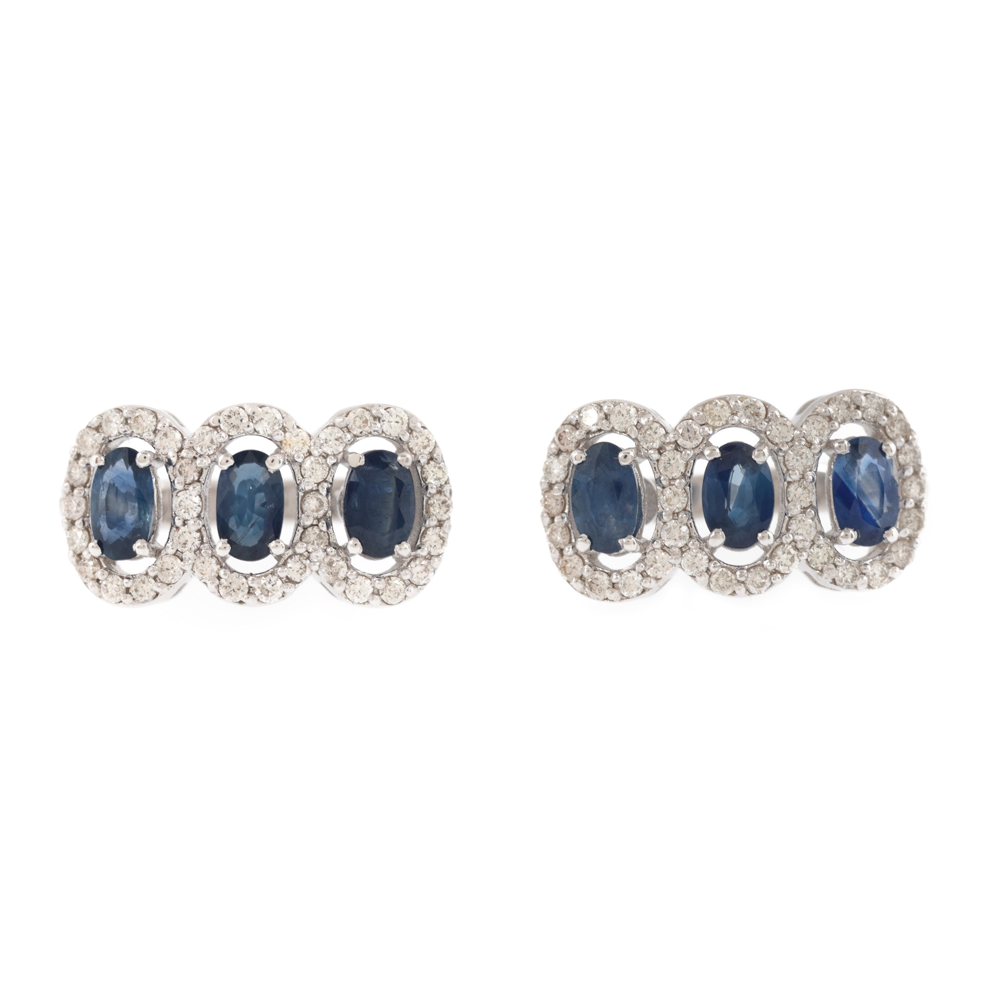 116. Pereche de cercei din aur alb, decorată cu triade de safire și diamante, însoțită de certificat gemologic IGL