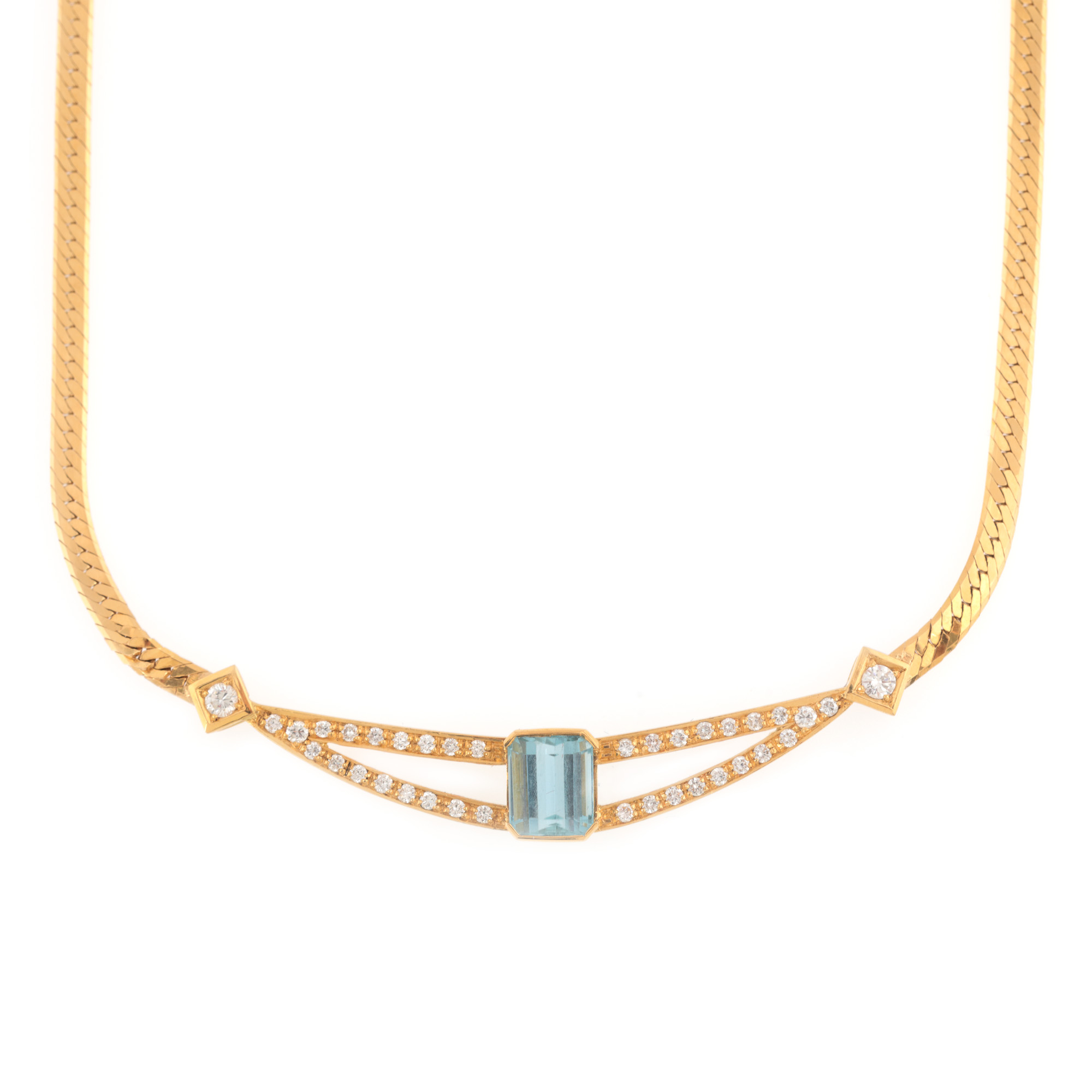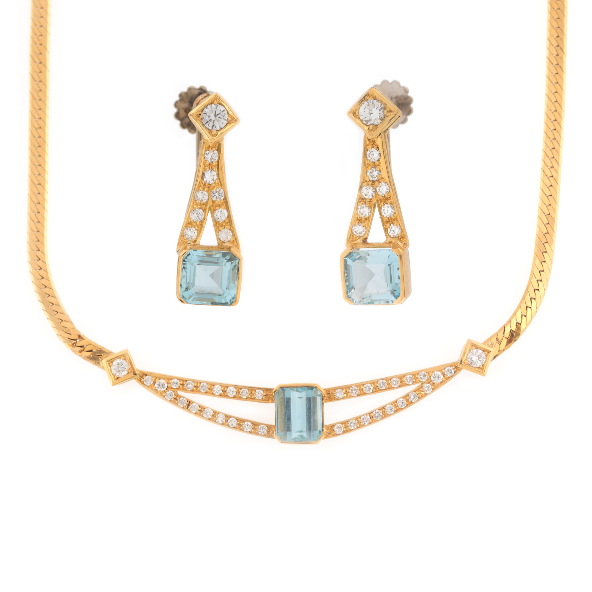 66. ”Royal Banquet” - demi-parure din aur, format din colier și pereche de cercei, decorat cu acvamarine și diamante, din colecția unui industriaș