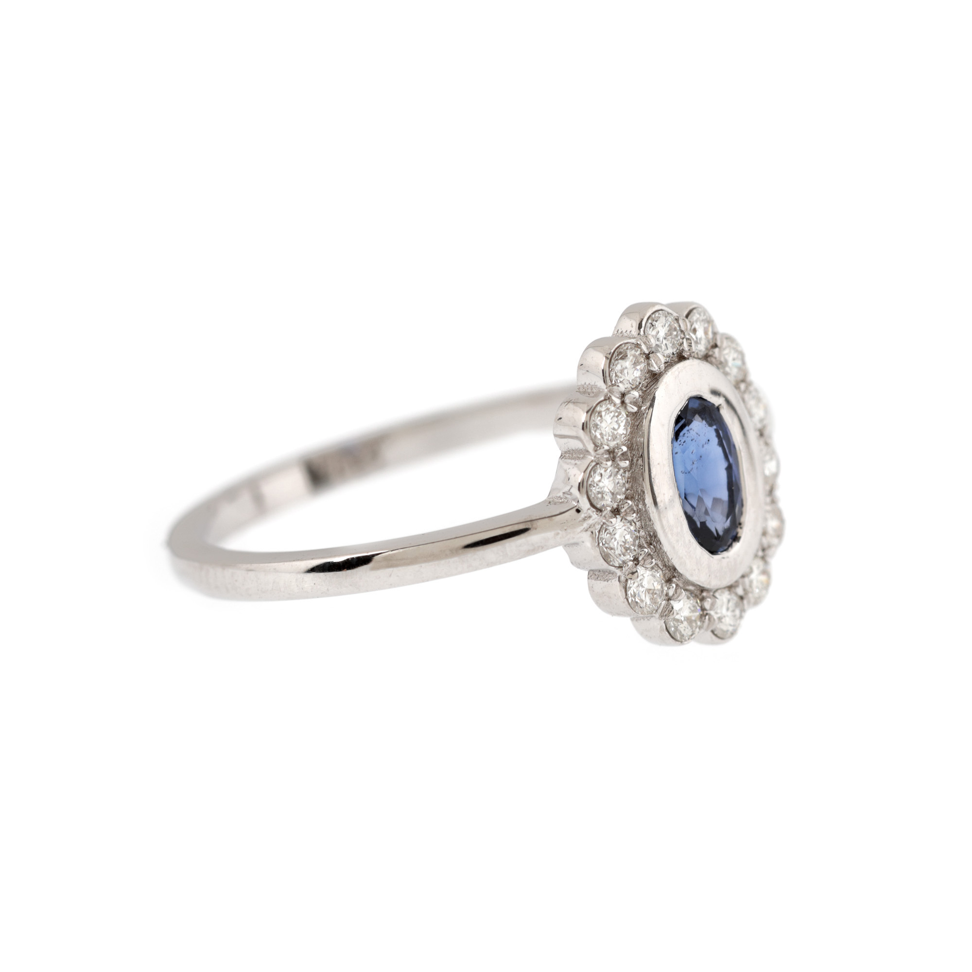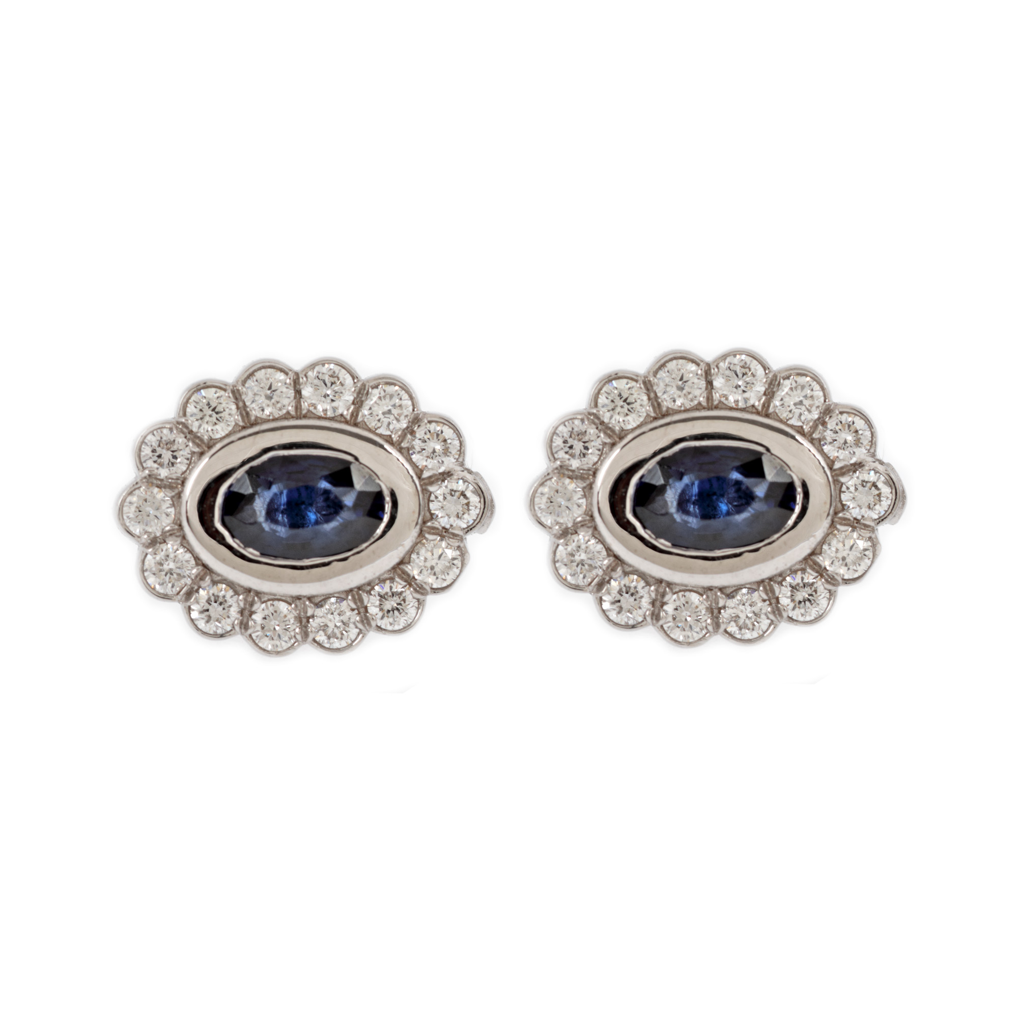 4 safire oval fațetate, culoare albastru, claritate SI, cca. 1,4 ct. și 56 diamante rotunde briliant, culoare G-H, claritate VS-SI1, cca. 0,65 ct.