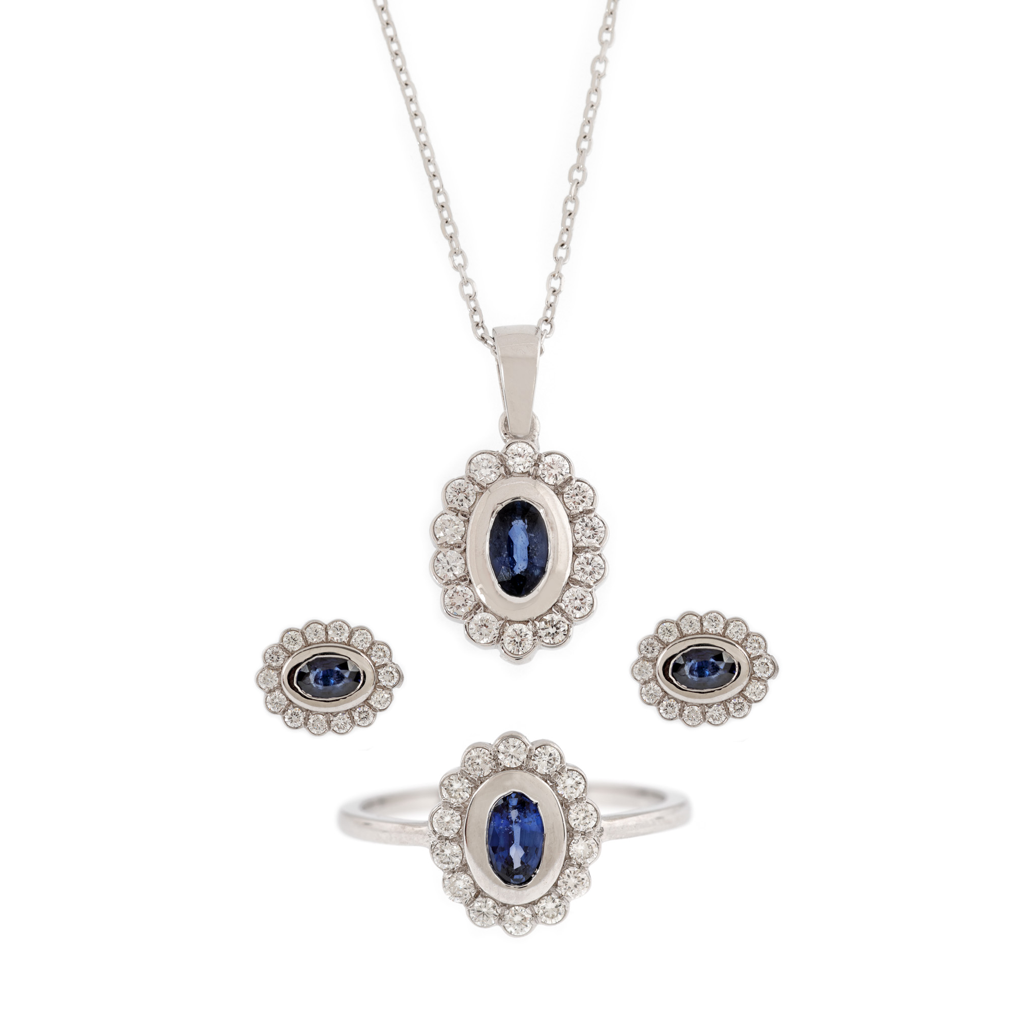 82. Set din aur alb, format din pereche de cercei, inel și lanț cu pandantiv, decorat cu safire și diamante