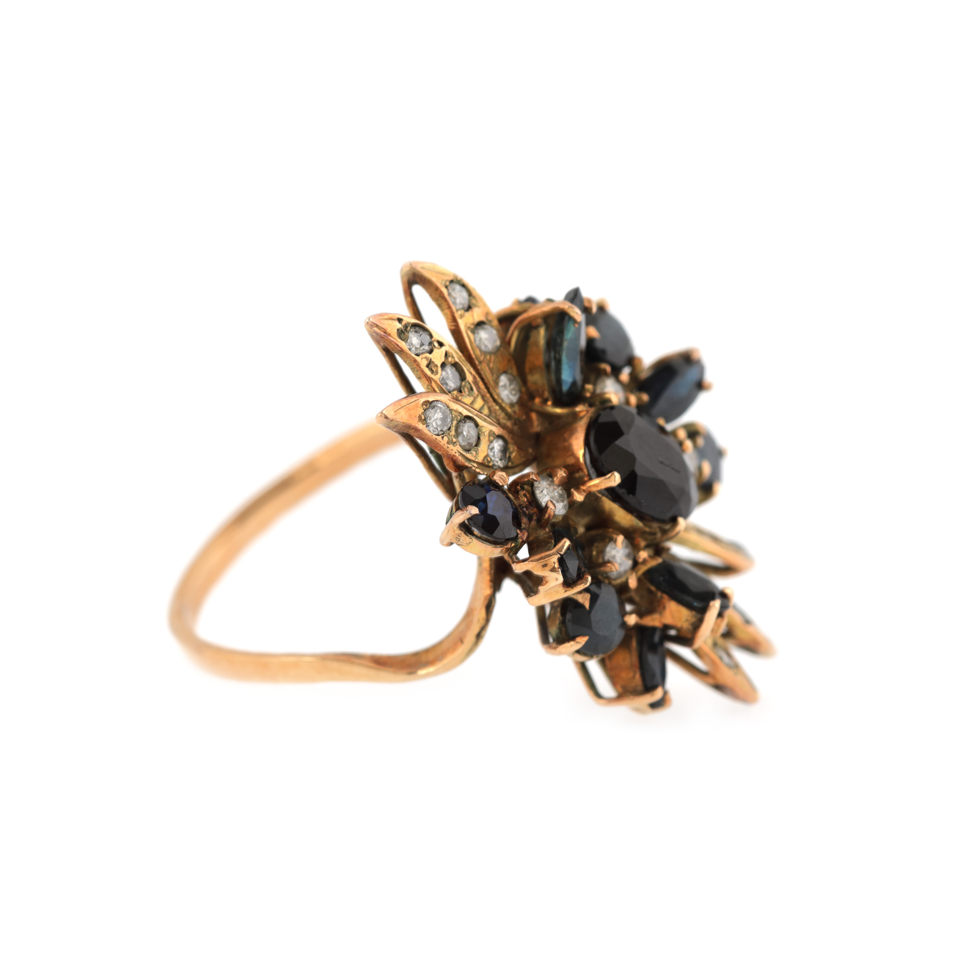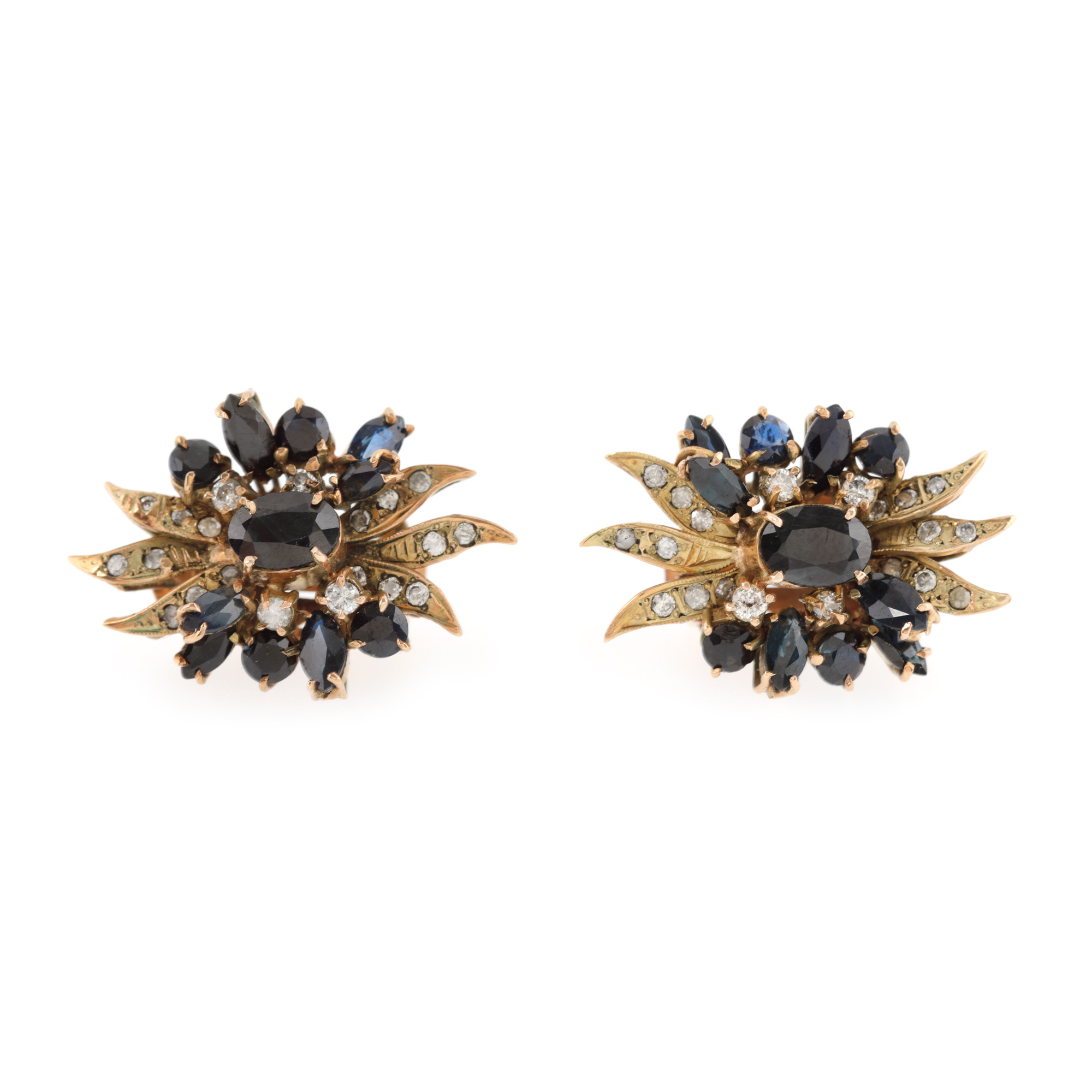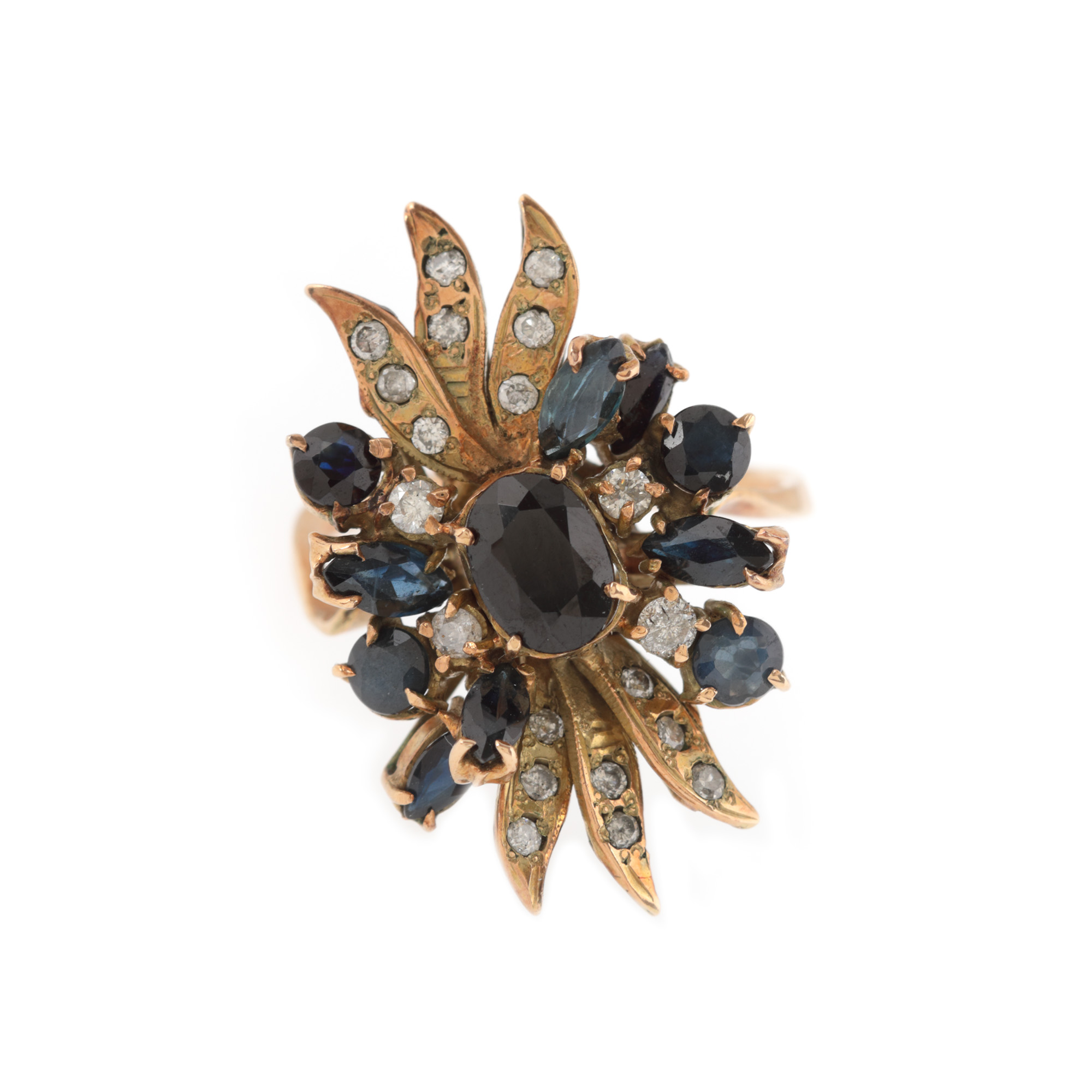 33 safire (3 oval fațetate, 18 marchiz fațetate, 12 rotund fațetate), culoare albastru, claritate SI-moderately included, cca. 8 ct. și 60 diamante rotunde briliant și single cut, claritate J-K, claritate SI2-I, cca. 1 ct.