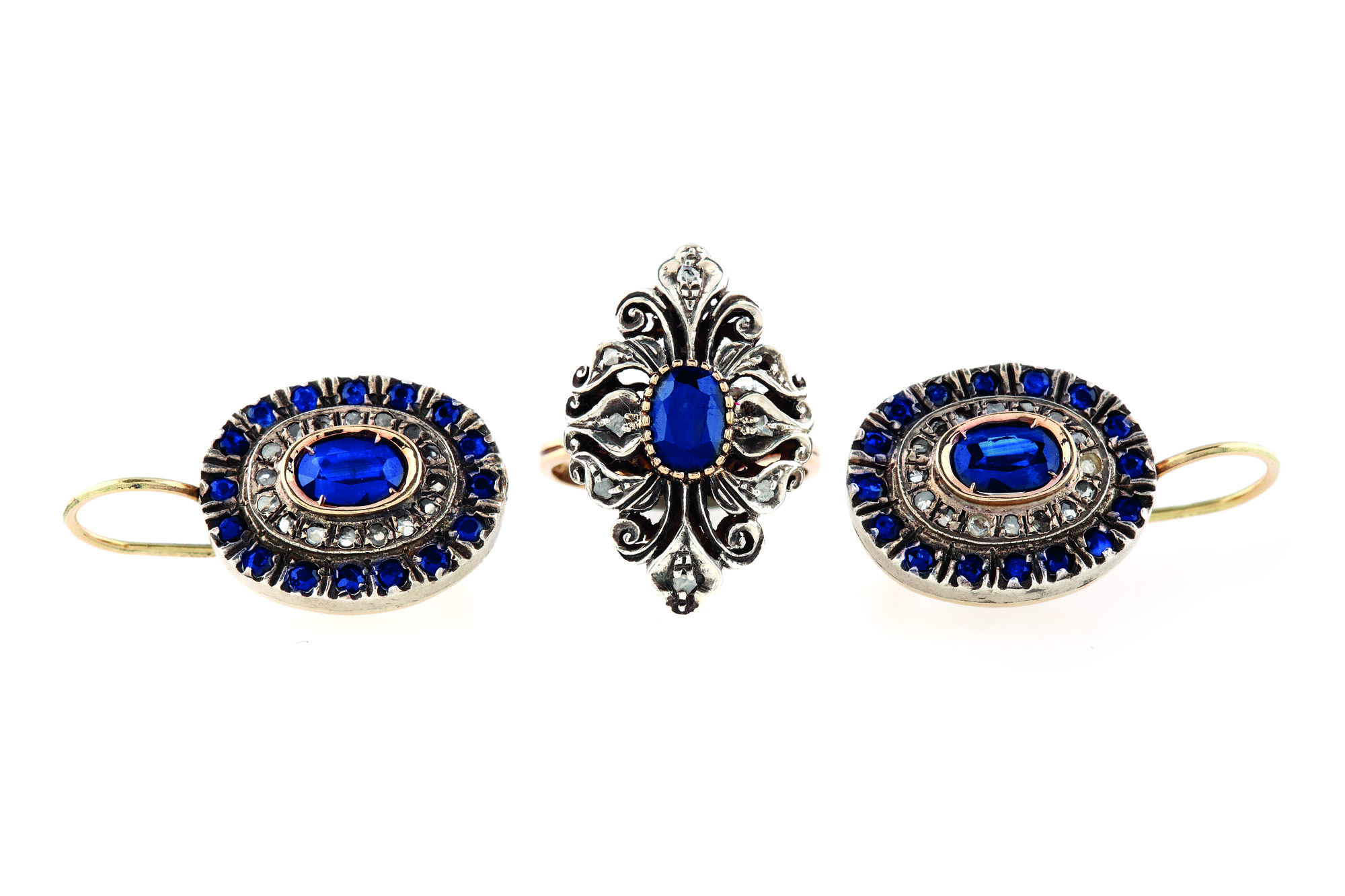2 safire oval faţetate cca. 2 ct., culoare albastru, claritate moderately included, 32 diamante rose cut cca. 0,08 ct., culoare K-L, claritate SI-I, 32 safire rotund faţetate cca. 0,8 ct. culoare albastru, claritate SI,1 safir oval faţetat cca. 1,1 ct., culoare albastru, claritate SI şi 7 diamante r