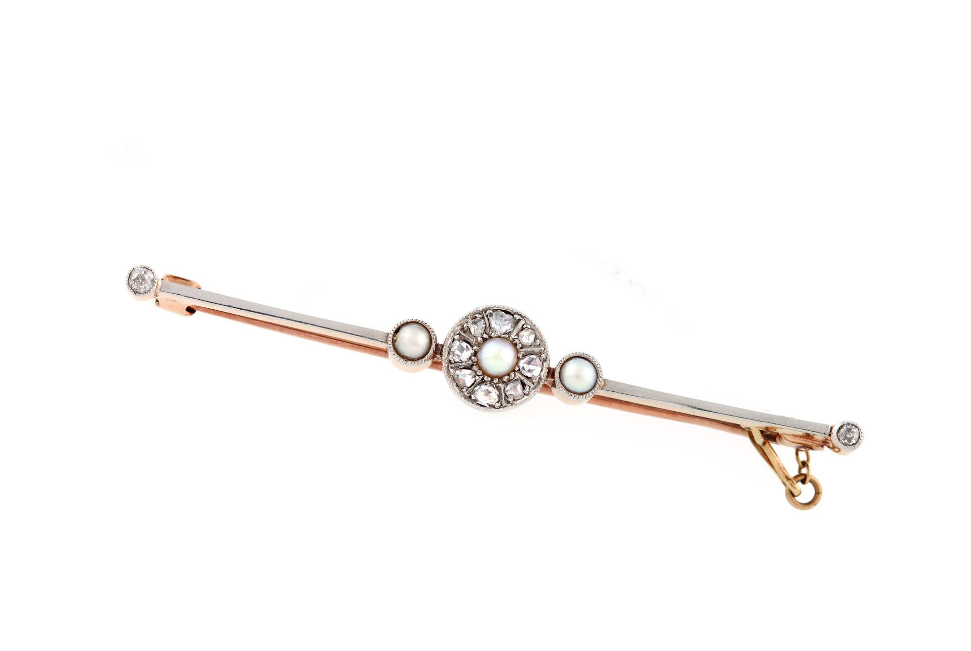 3 perle de cultură rotunde, albe, d=2,8-2,9 mm şi 10 diamante (2 old mine cut şi 8 rose cut) cca. 0,1 ct., culoare H-L, claritate SI-I