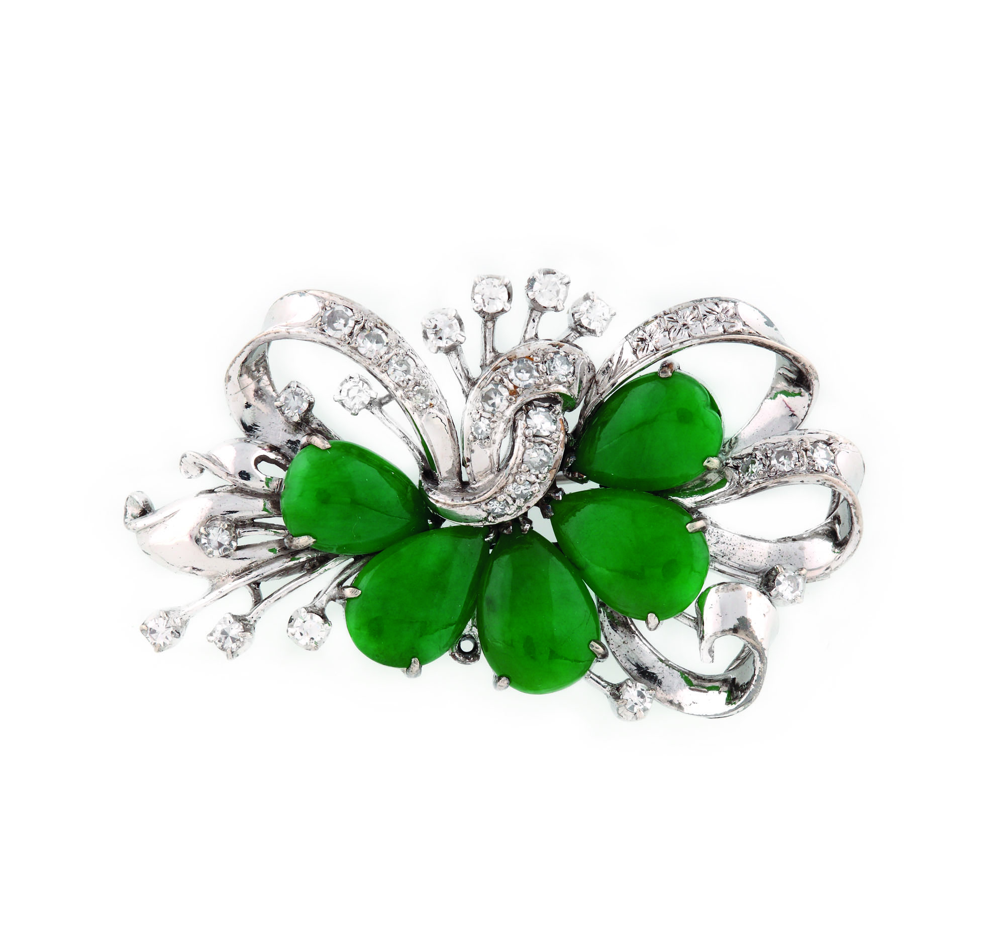 438. Broşă din aur alb, ornată cu diamante şi jaduri