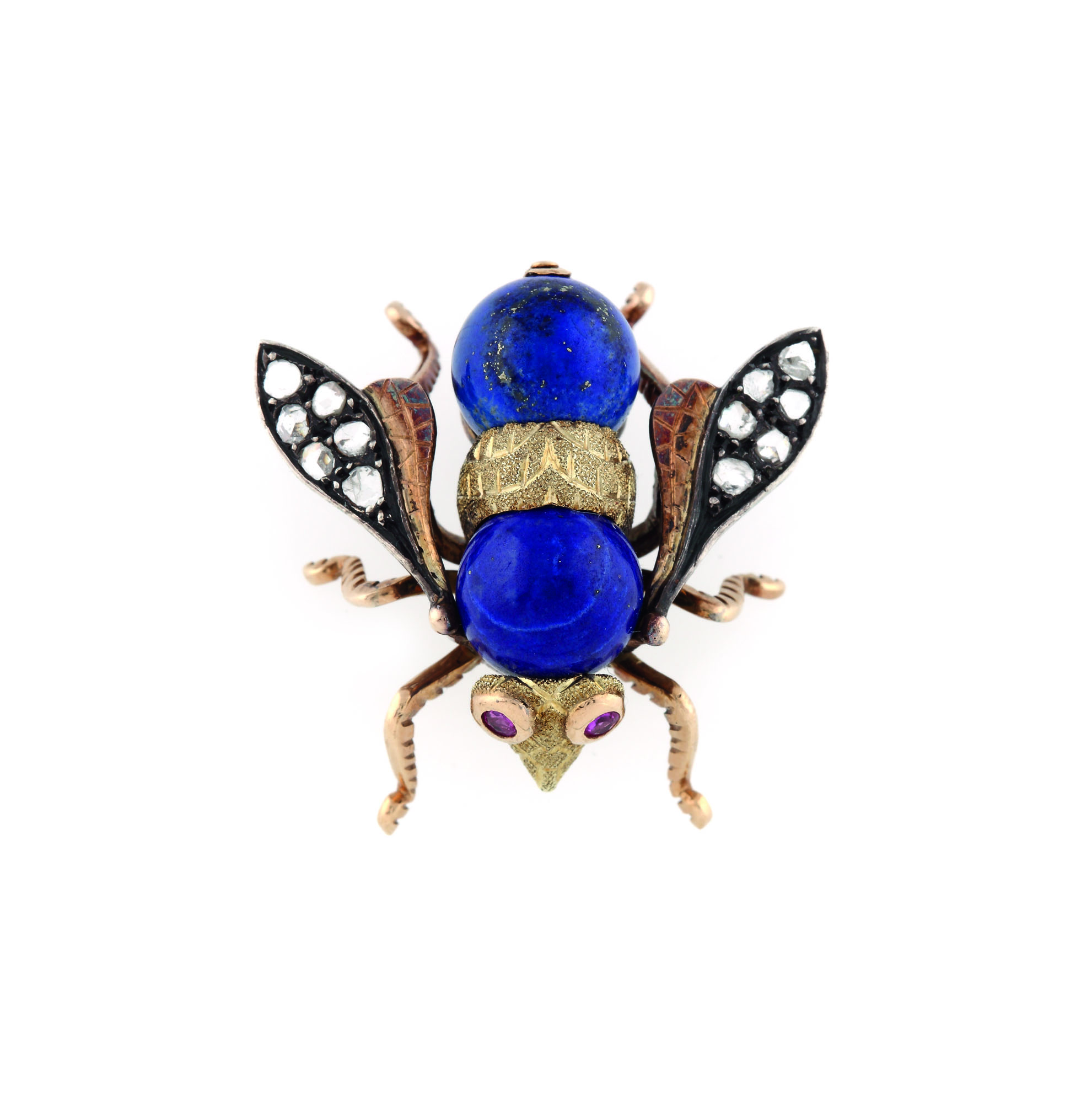 414. Broşă din aur, decorată cu diamante, rubine şi Lapis Lazuli, în formă de albinuţă