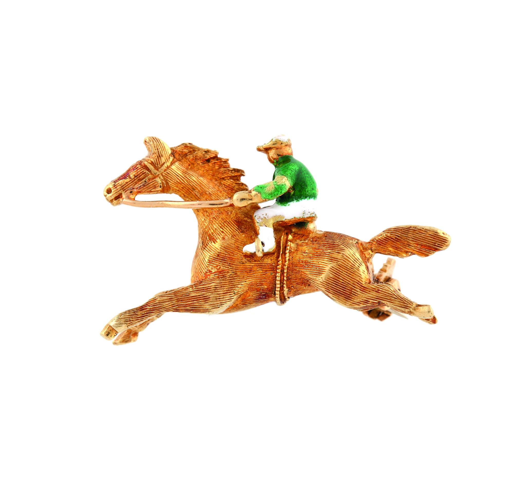 345. Broșă din aur, decorată cu email, în formă de jocheu călare [A doua jumătate a sec. XX]