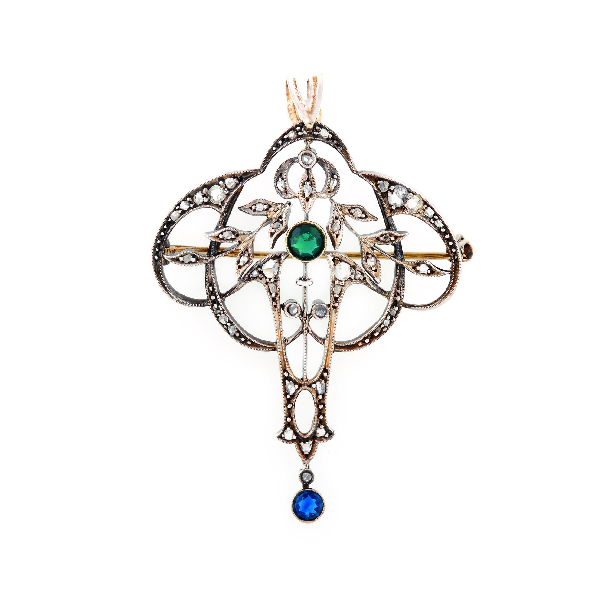 424. Broşă-pandantiv din aur şi argint, decorată cu safire şi diamante, cca. 1900