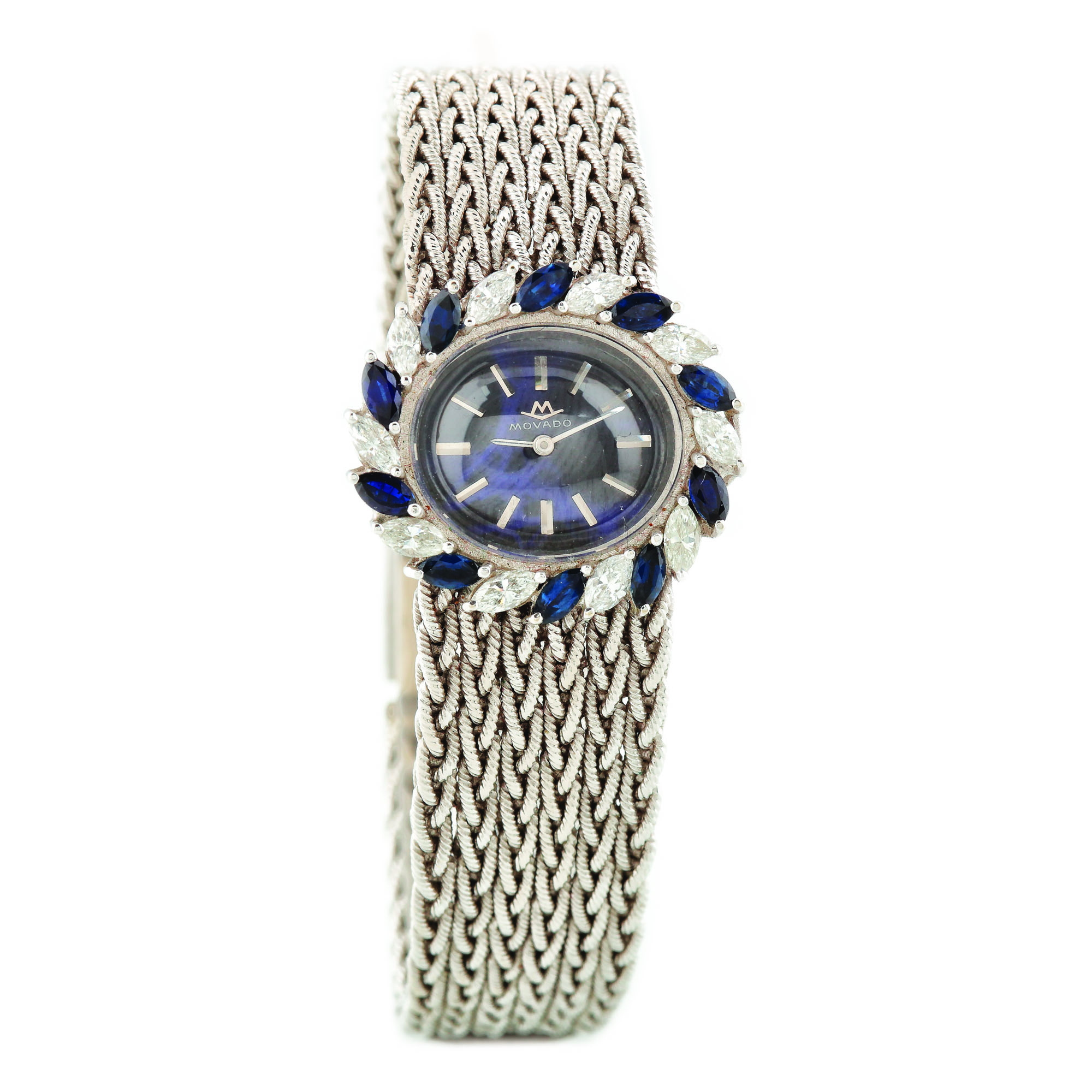 Ceas Movado, de mână, de damă,din aur alb frumos decorat cu diamante și safire. Cadran de culoare albastră, mecanism cu armare manuală,