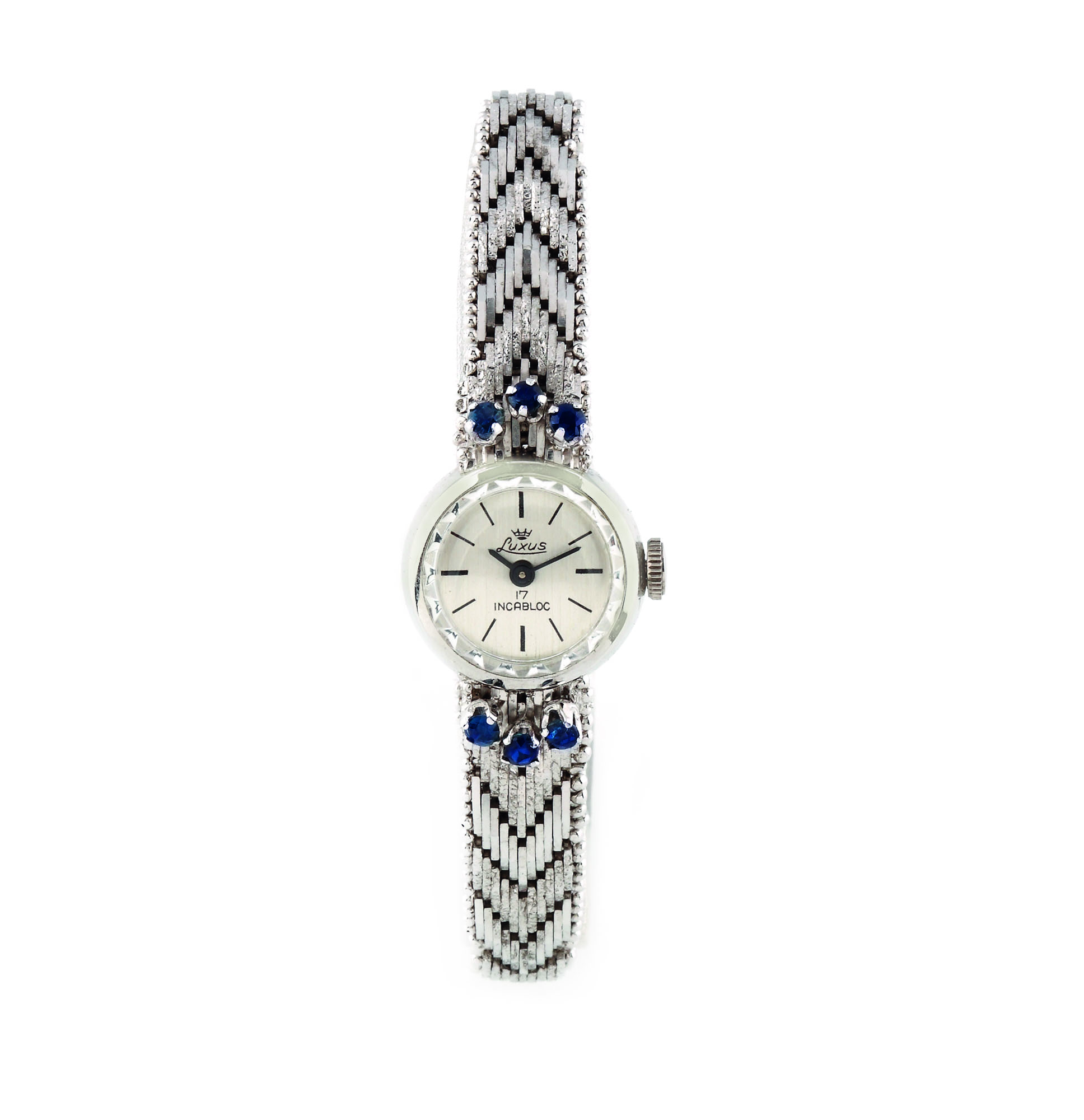 369. Elegant ceas Luxus de mână, de damă, din argint, ornat cu safire [Anii '70]