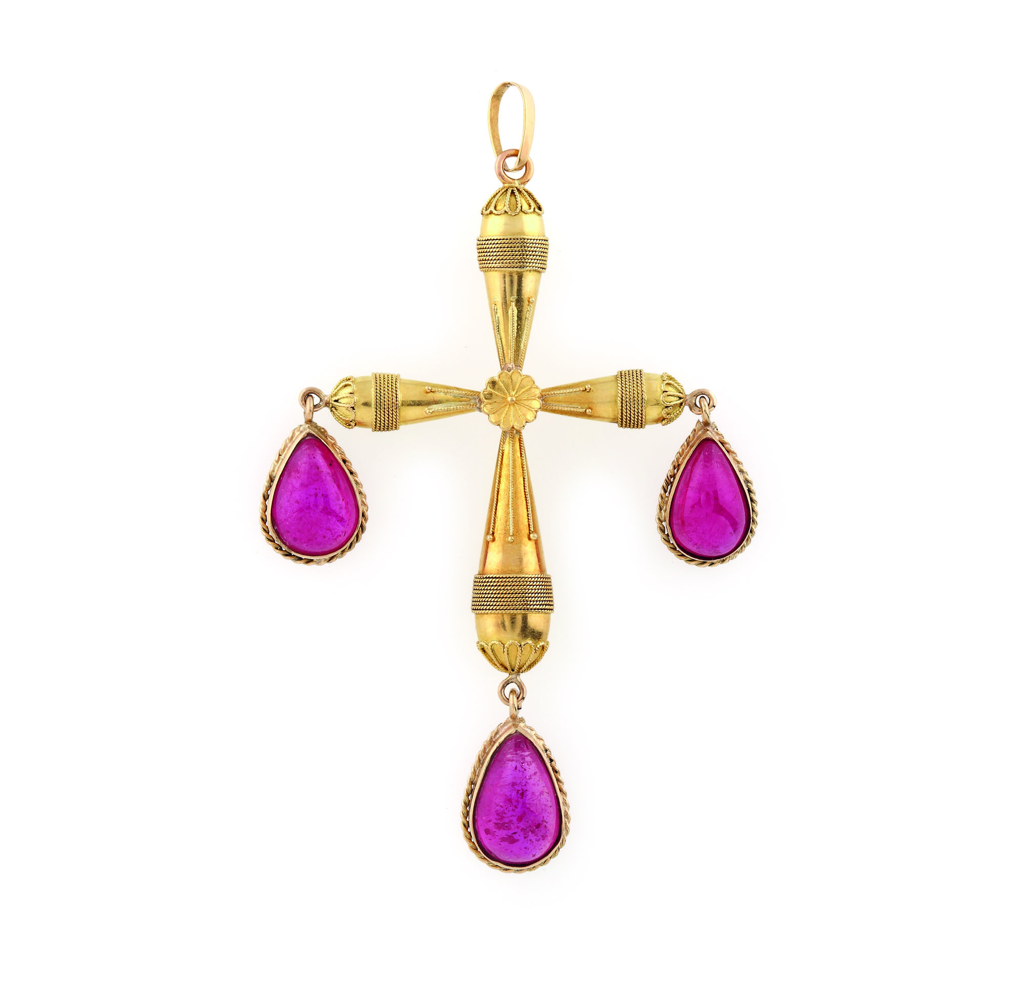 320. "Etruscan Revival" - pandantiv cruce din aur, decorat cu rubine, cca. 1860-1880