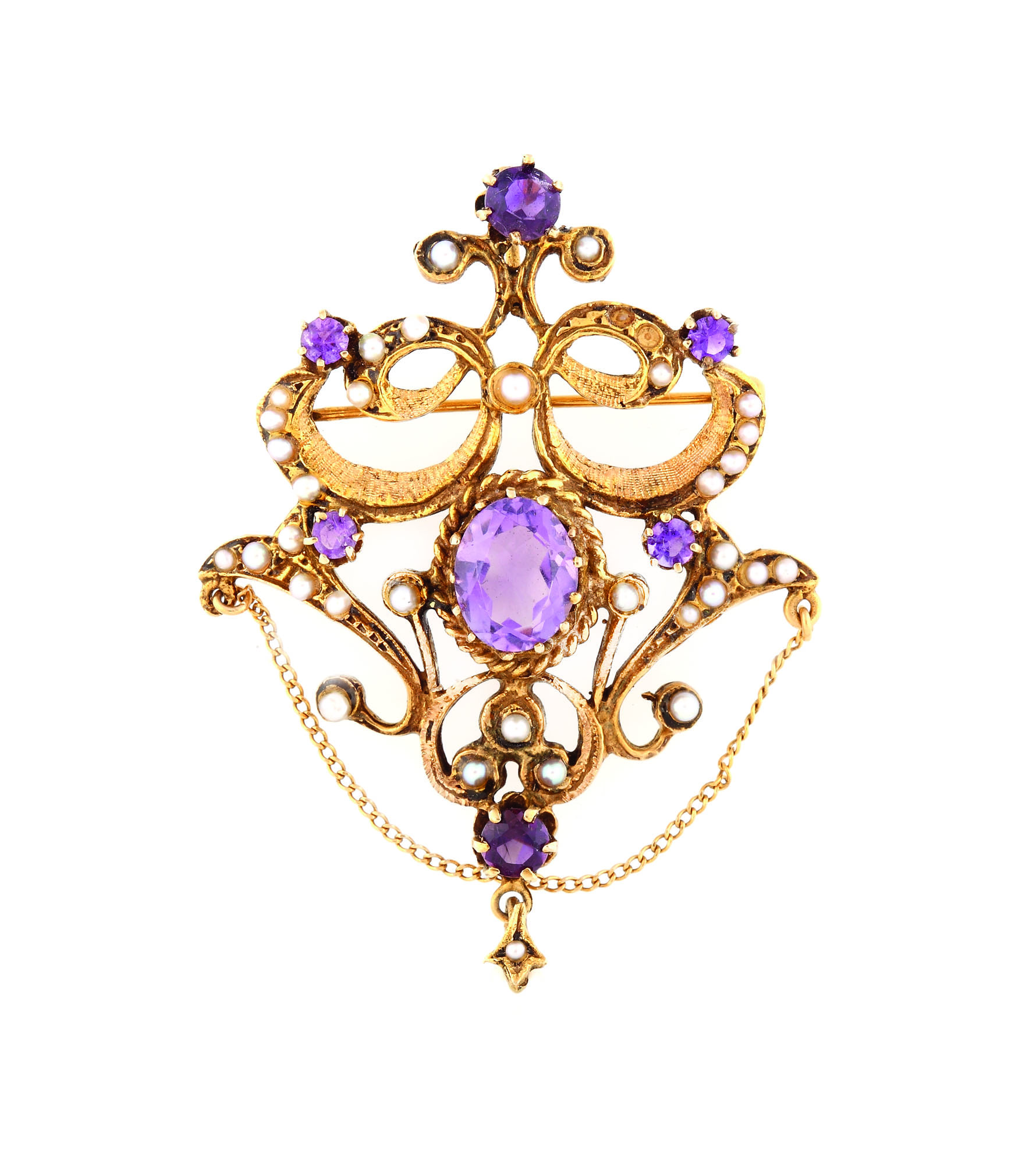 361. Frumoasă broșă din aur, decorată cu ametiste și perle [Cca. 1960-1970]