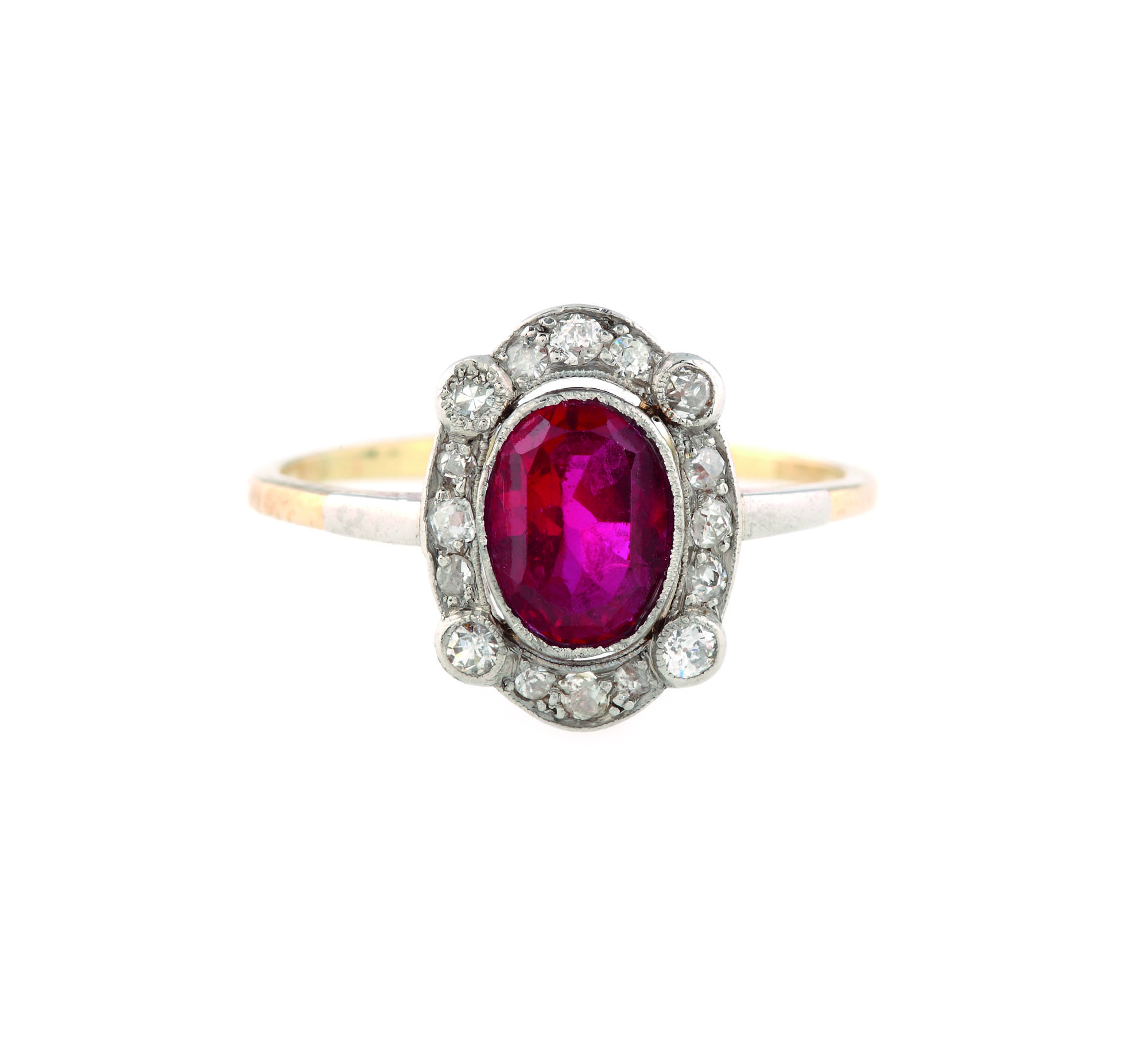 16 diamante old mine cut, single cut cca. 0,16 ct., culoare J-K, claritate SI-I1; rubin de sinteză, abrazat, cu o zgârietură pe table