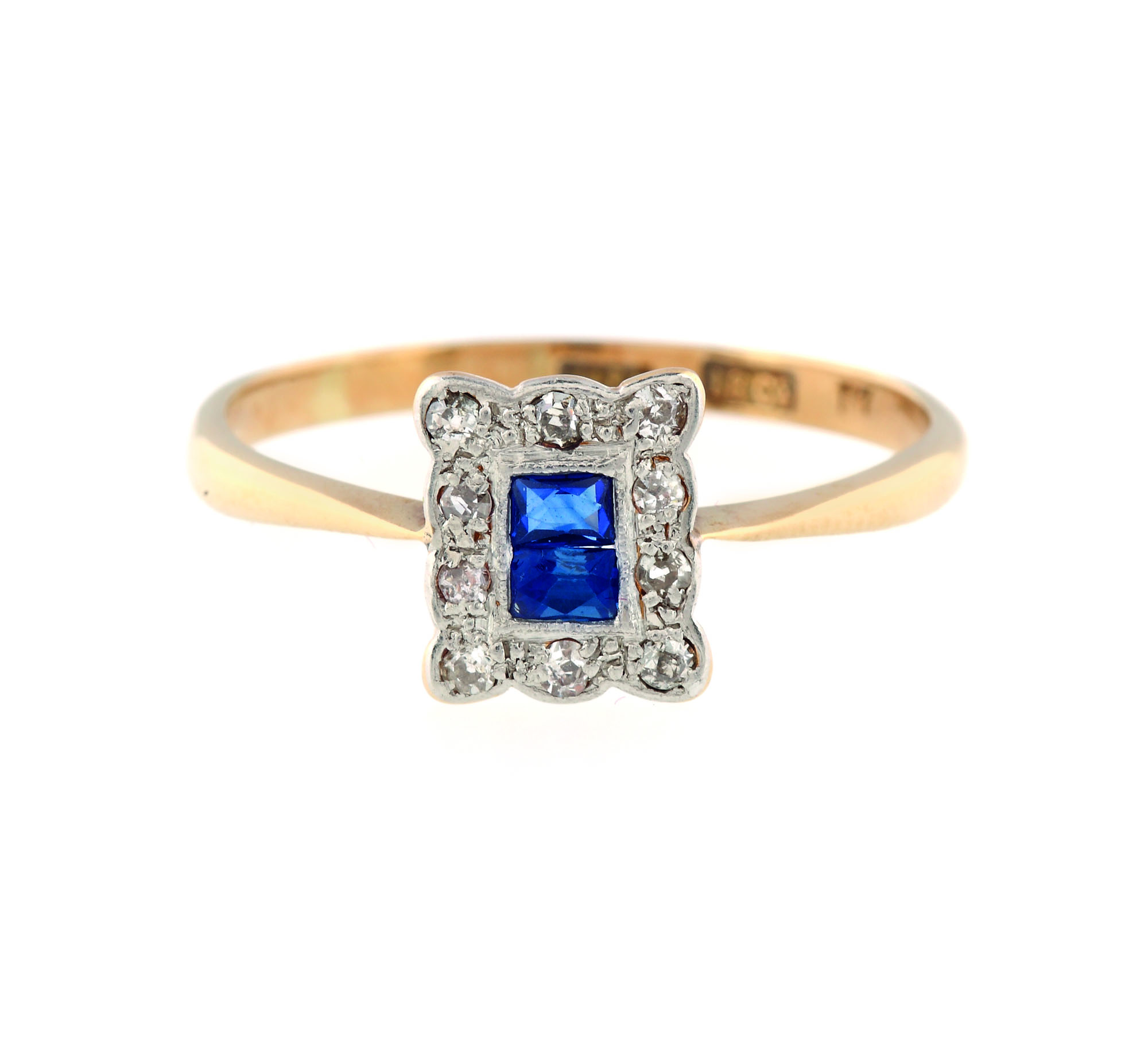 2 safire rectangular faţetate cca. 0,12 ct., culoare albastru, claritate eye-clean şi 10 diamante rotunde single cut cca. 0,07 ct., culoare J-K, claritate SI-I1
