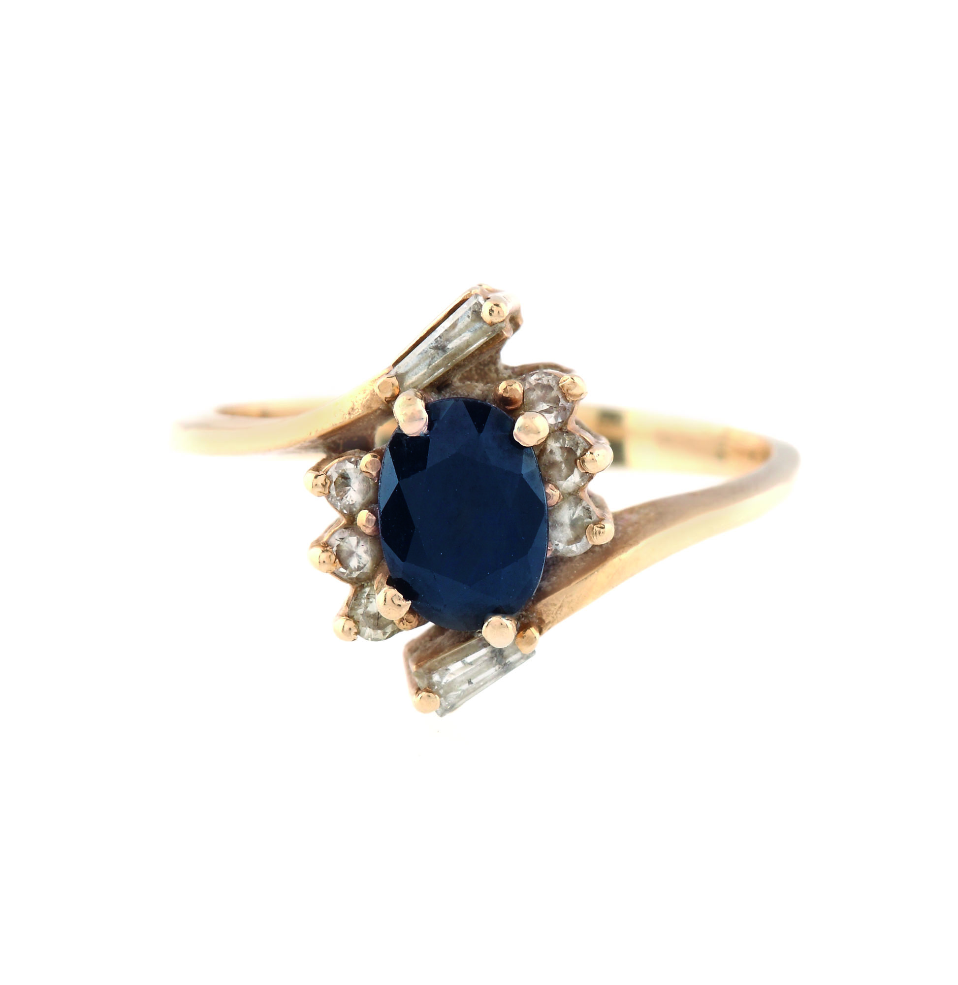 1 safir oval faţetat cca. 1,1 ct., culoare albastru, claritate SI şi 8 diamante (6 rotunde briliant şi 2 baghete) cca. 0,22 ct., culoare L-M, claritate SI-I1