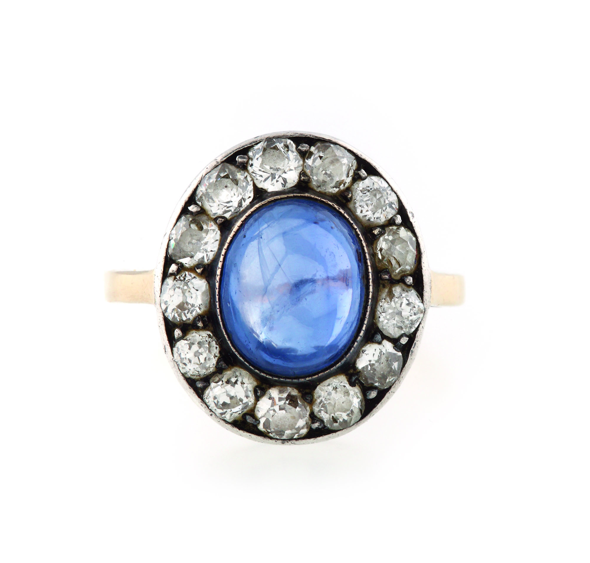 1 safir oval faţetat cca. 4,7 ct., culoare albastru-violet, claritate SI şi 13 diamante old mine cut cca. 1,25 ct., culoare J-K, claritate SI-I1 (2 prezintă ciobituri, cavităţi)