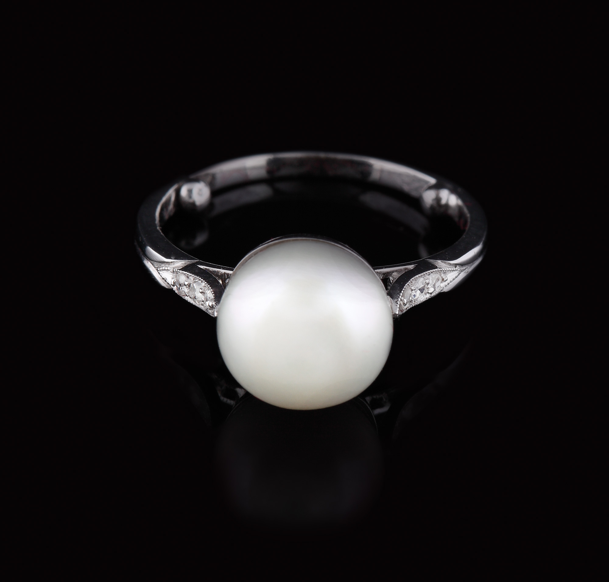 396. Inel din platină, ornat cu perlă şi diamante, cca. 1920