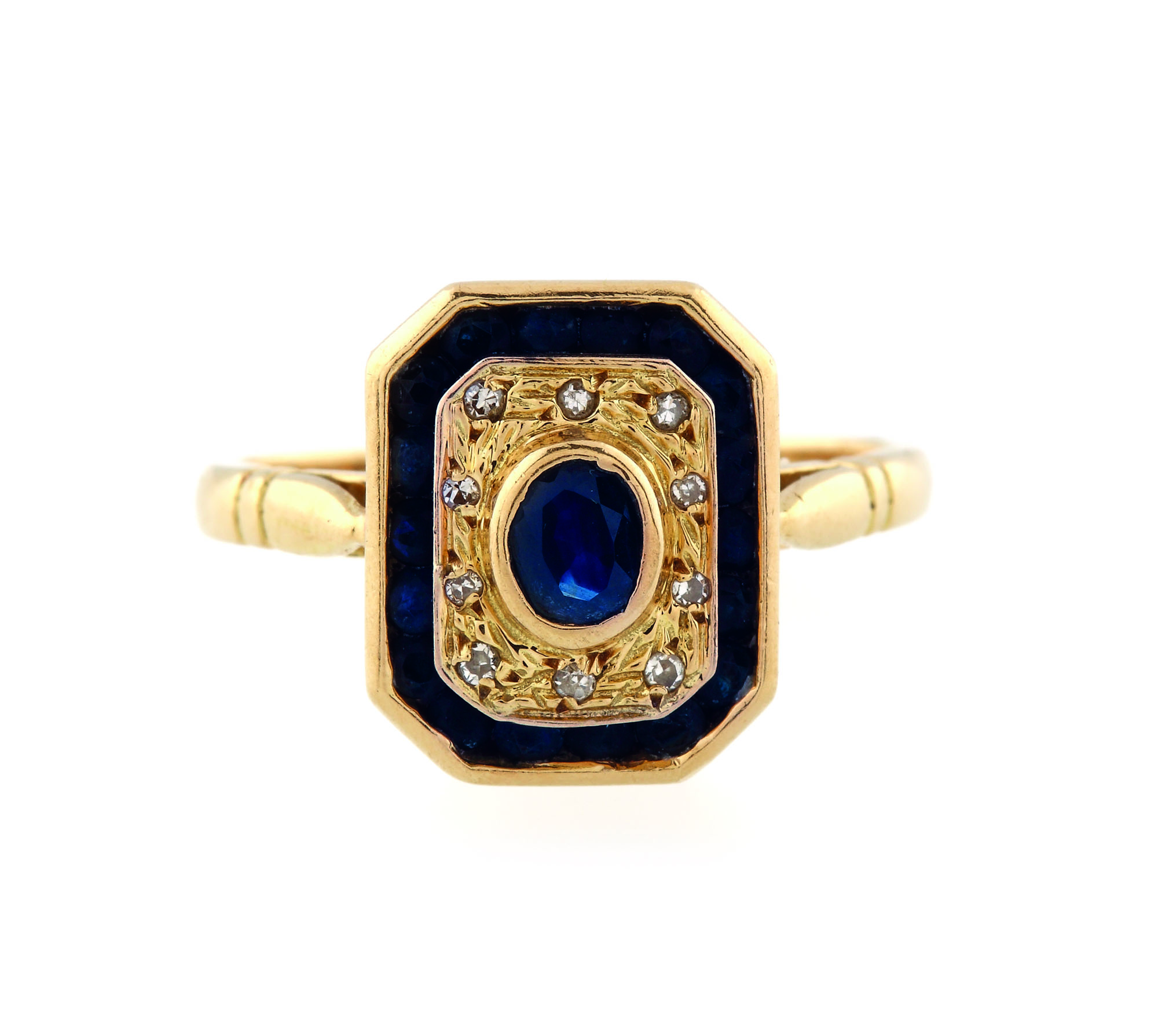1 safir oval faţetat cca. 0,3 ct., culoare albastru, claritate SI, 18 safire rotund faţetate cca. 0,36 ct., culoare albastru, claritate SI şi 10 diamante rotunde single cut cca. 0,05 ct., culoare M-N, claritate SI