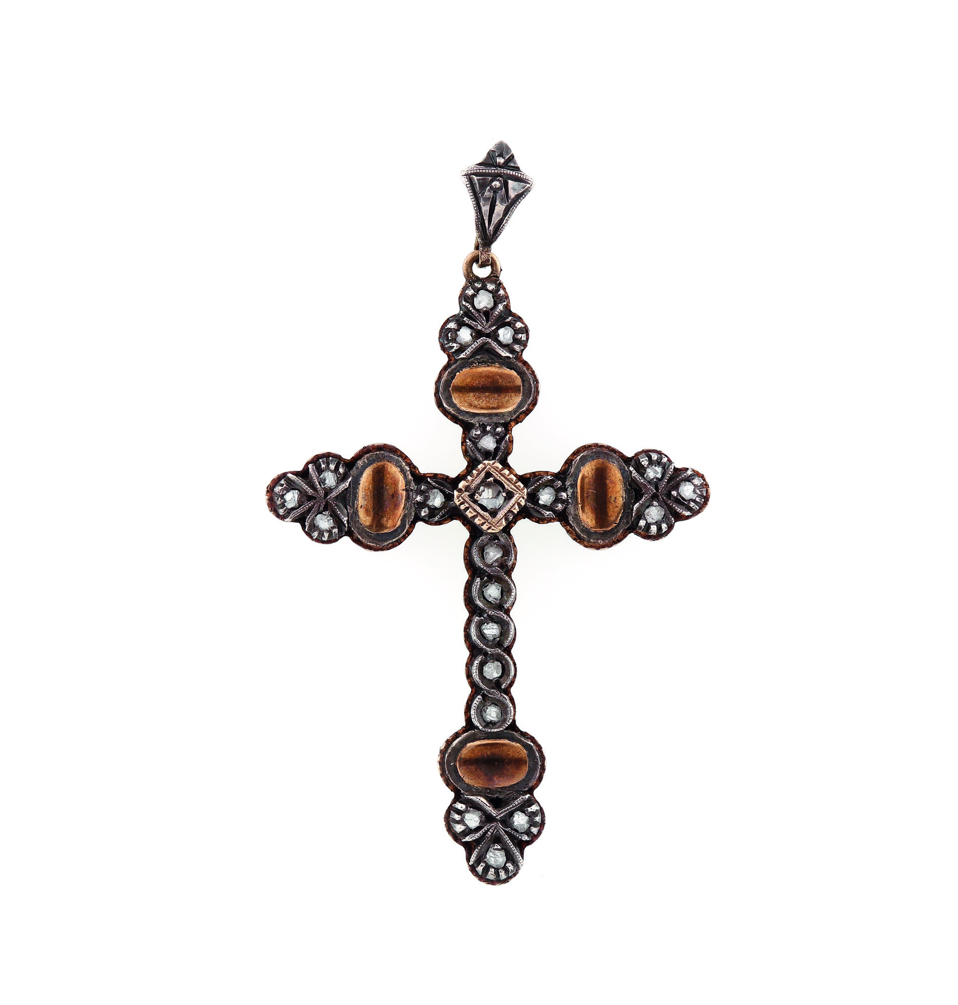 478. Pandantiv-cruce din aur şi argint, ornat cu diamante, executat manual