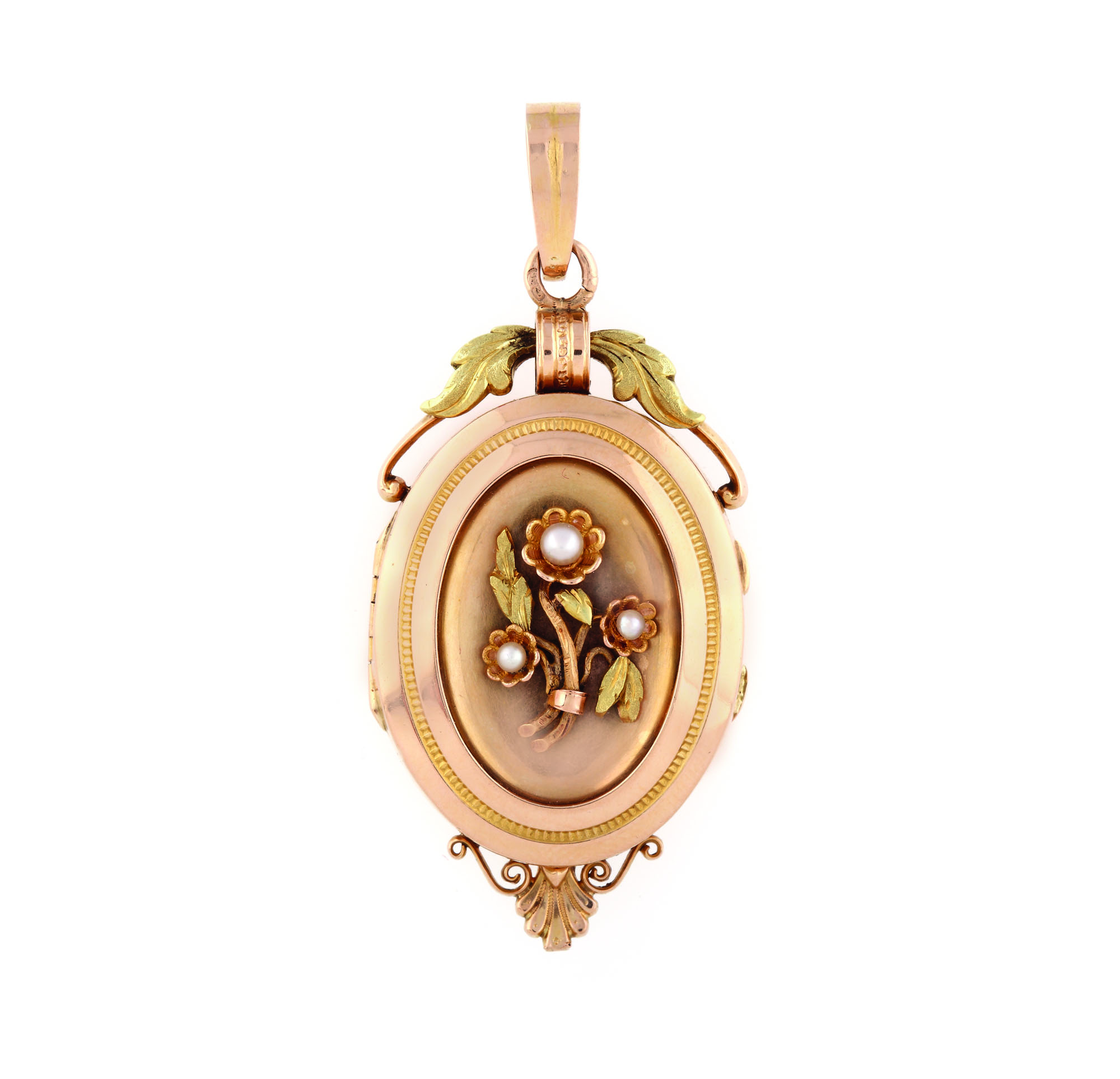 401. Pandantiv-medalion din aur, decorat cu aplicaţie florală cu perle, cca. 1910-1920