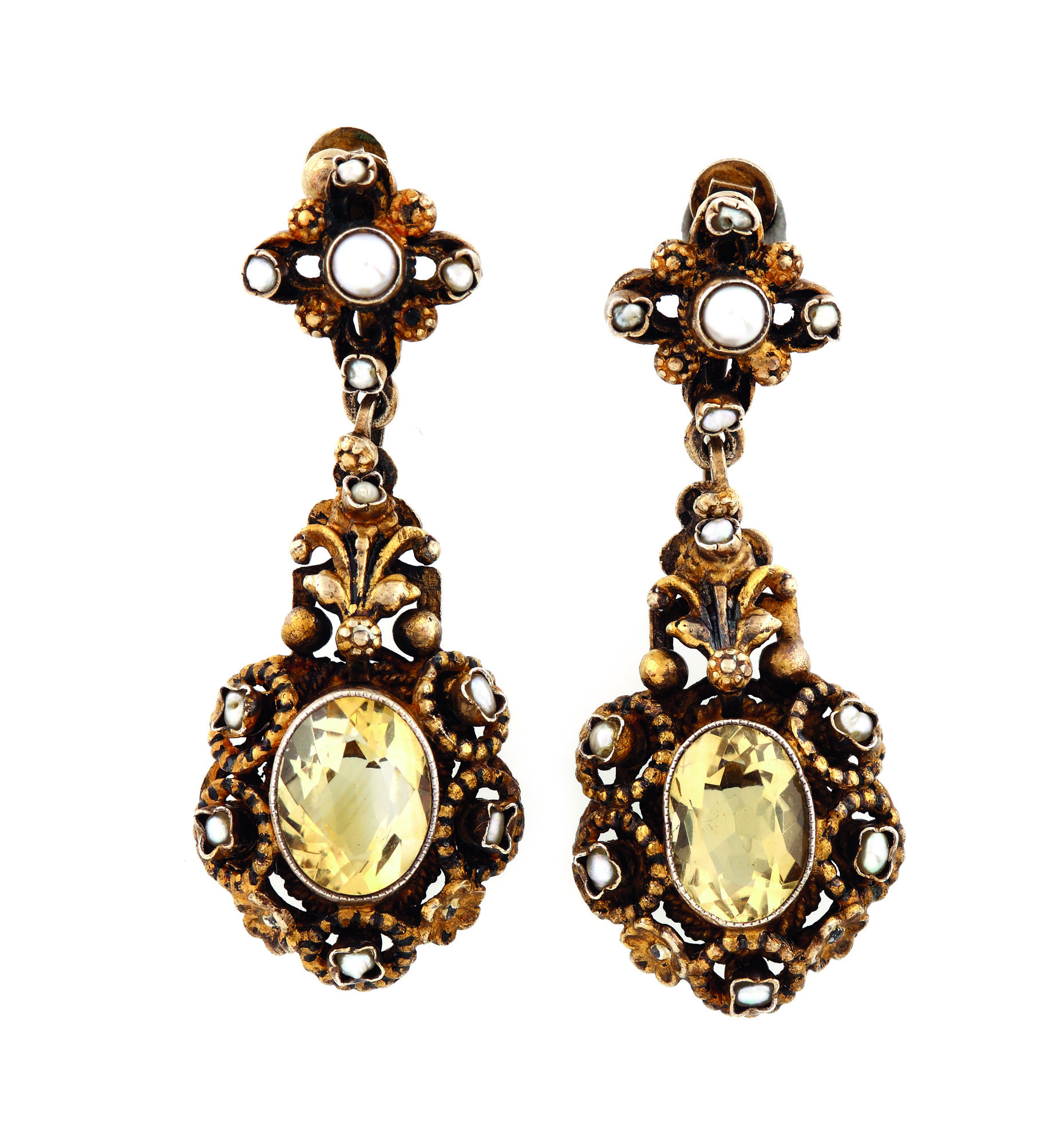 479. Pereche de cercei din argint aurit, decorată cu citrine şi perle