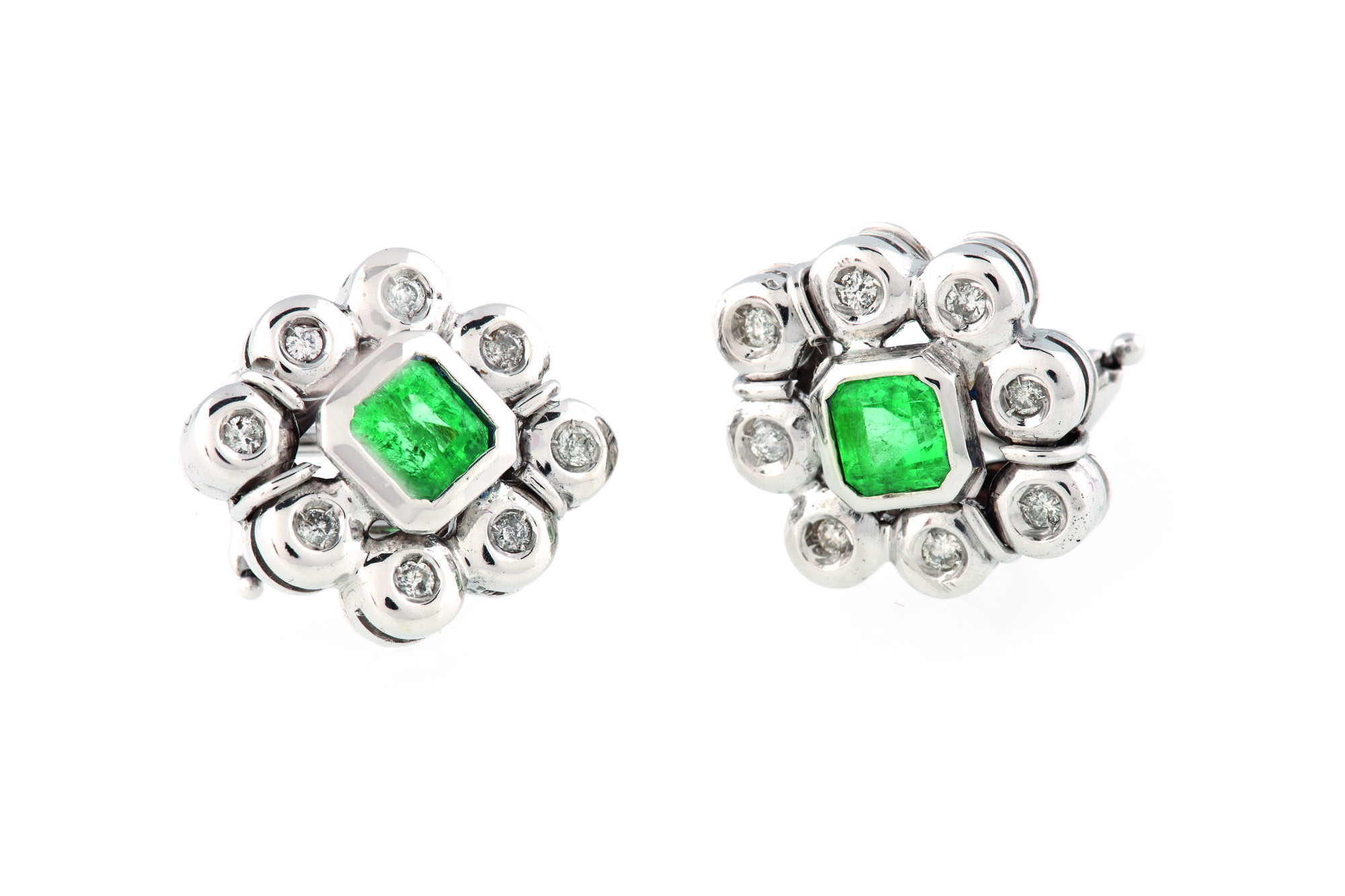 437. Pereche de cercei din aur alb, decorată cu diamante si smaralde