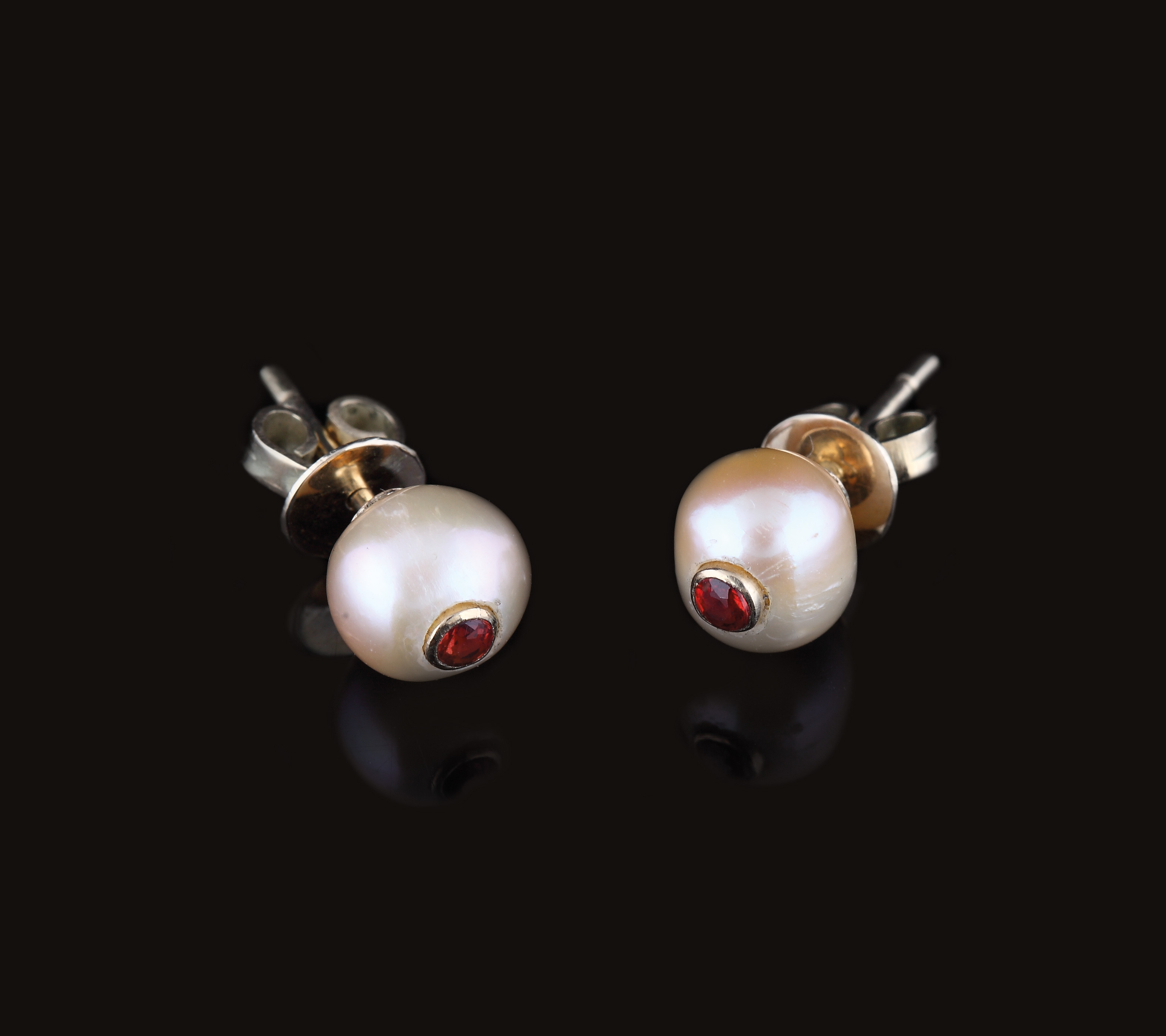 2 perle de cultură rotunde, galbene d=7,73-7,78 mm și 2 safire portocalii rotund fațetate cca. 0,12 ct., culoare portocaliu, claritate SI