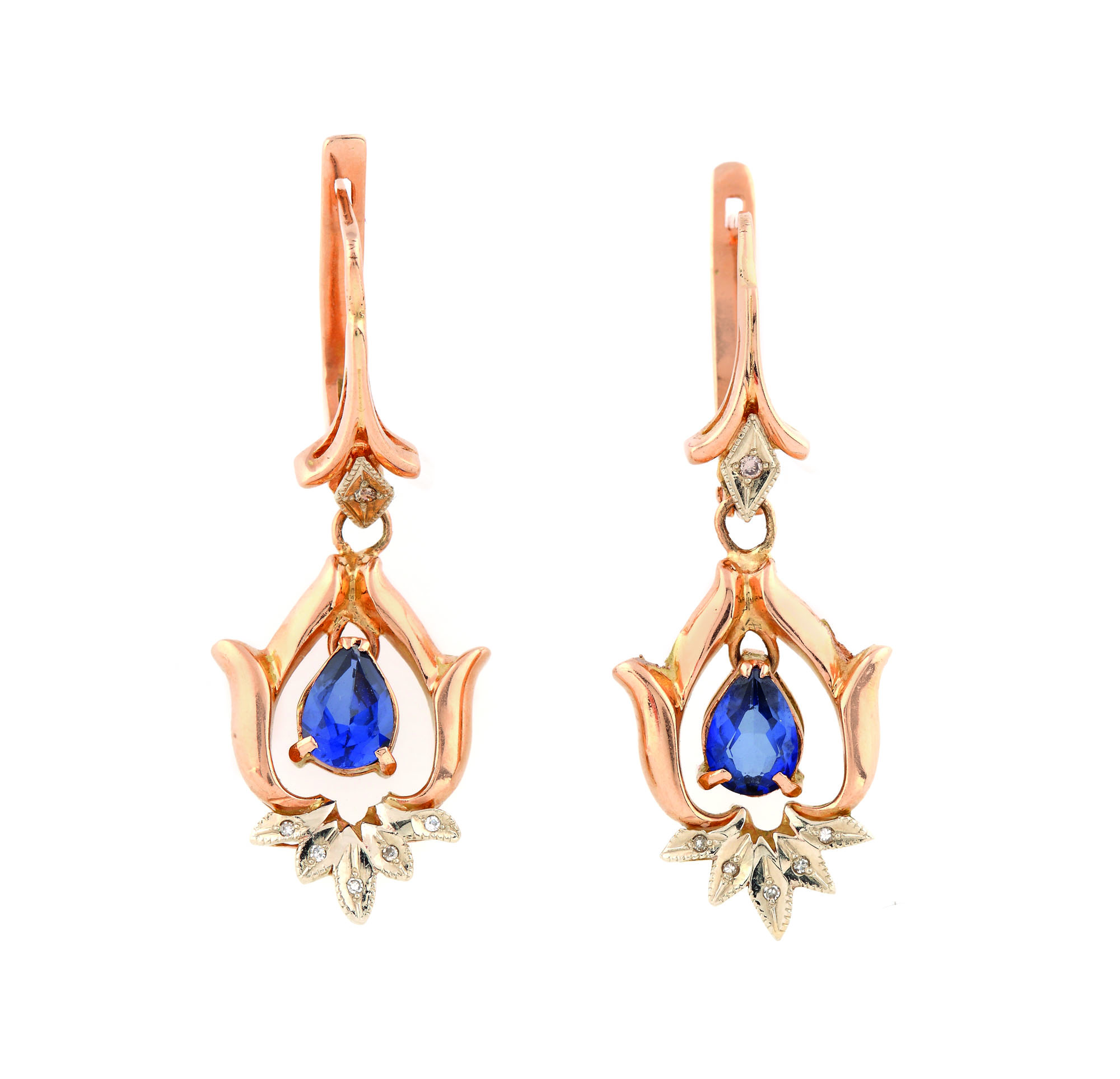 515. Pereche de cercei din aur roşu, decorată cu diamante şi safire
