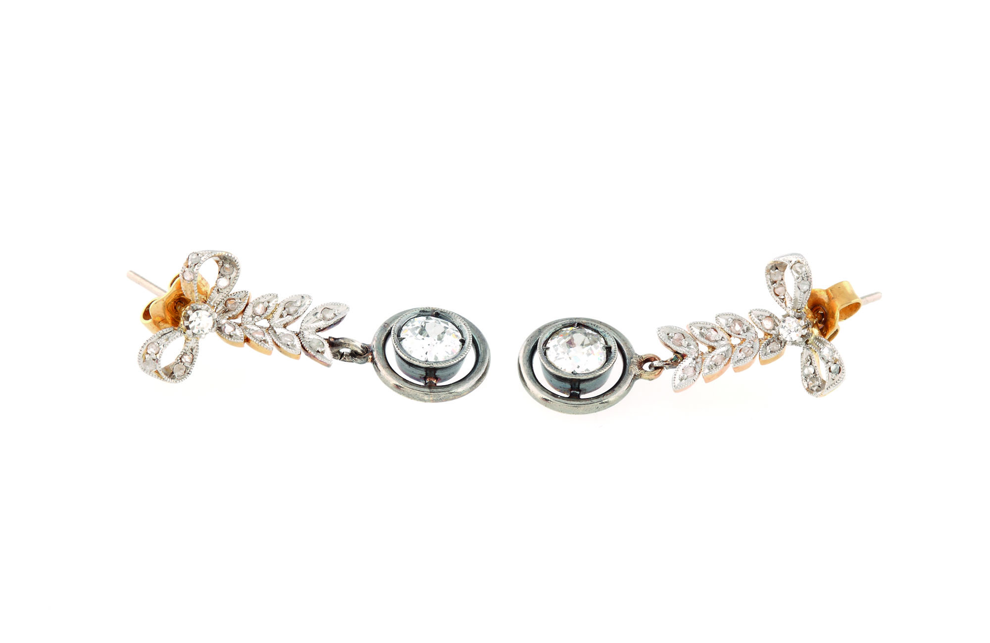 2 diamante rotunde european cut cca. 1,1 ct., culoare K-L, claritate VS2; SI2, 2 diamante rotunde single cut cca. 0,08 ct., culoare I-J, claritate SI2-I1, 32 diamante rose cut cca. 0,1 ct., culoare J-K, claritate SI2-I2