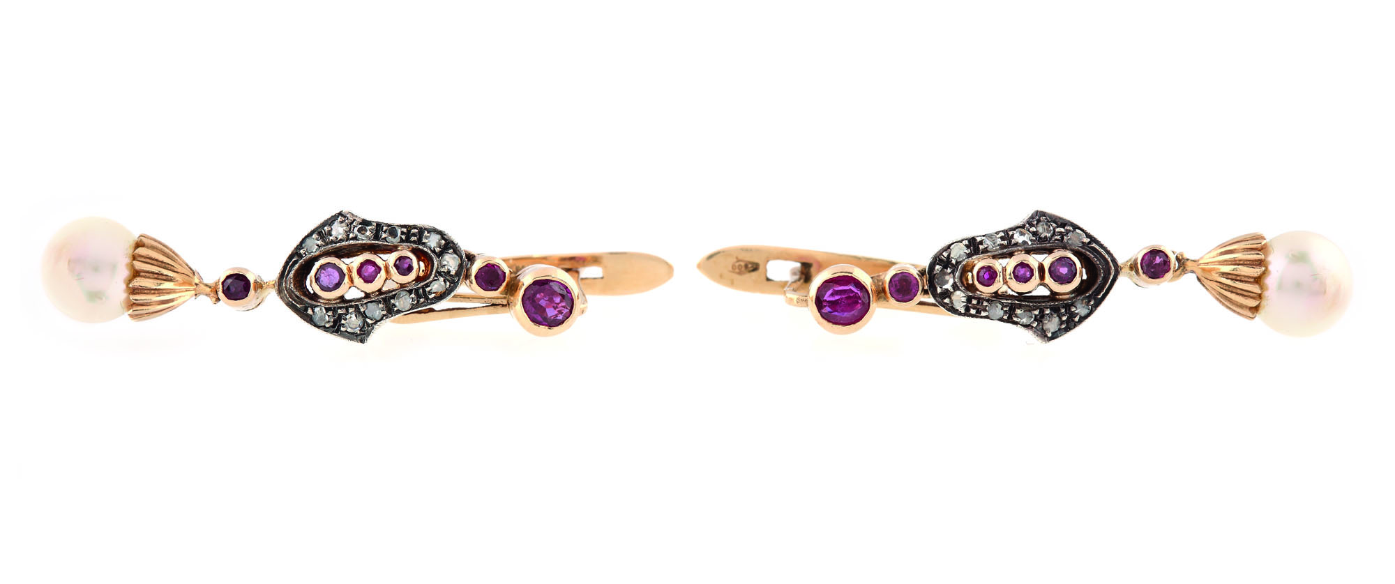 460. Pereche de cercei din aur şi argint, decorată cu diamante, rubine şi perle