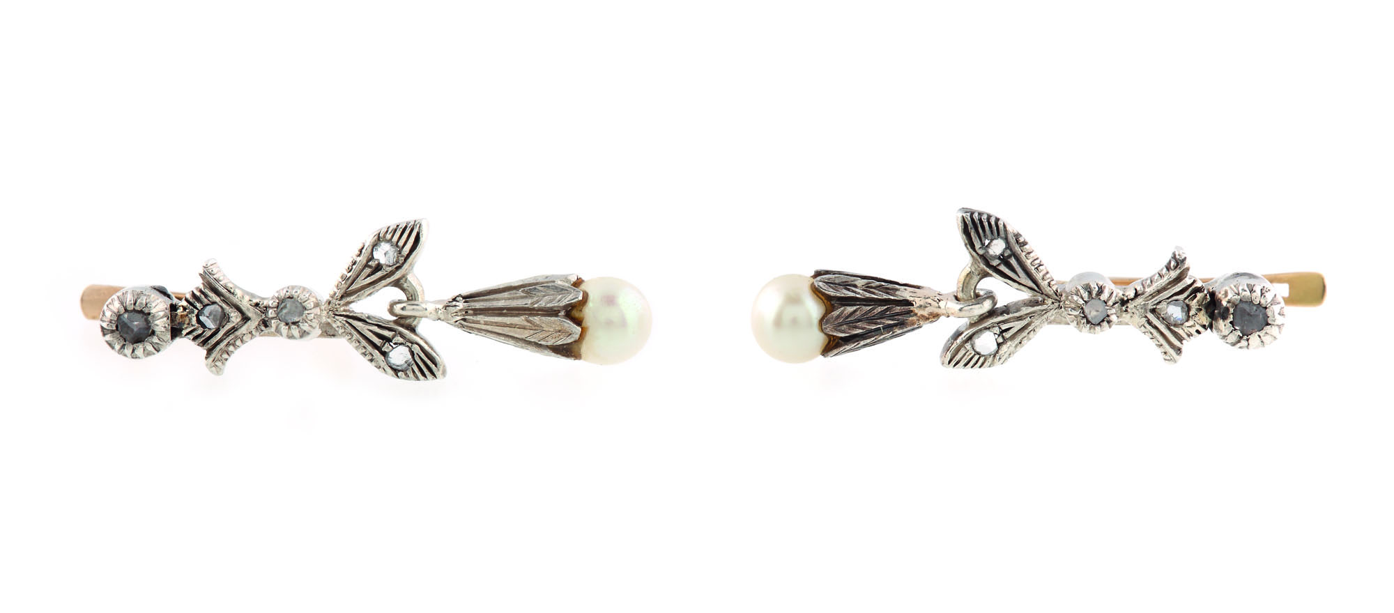 10 diamante rose cut cca. 0,06 ct., culoare K-L, claritate SI-I, 2 perle de cultură rotunde albe d=4,57 mm