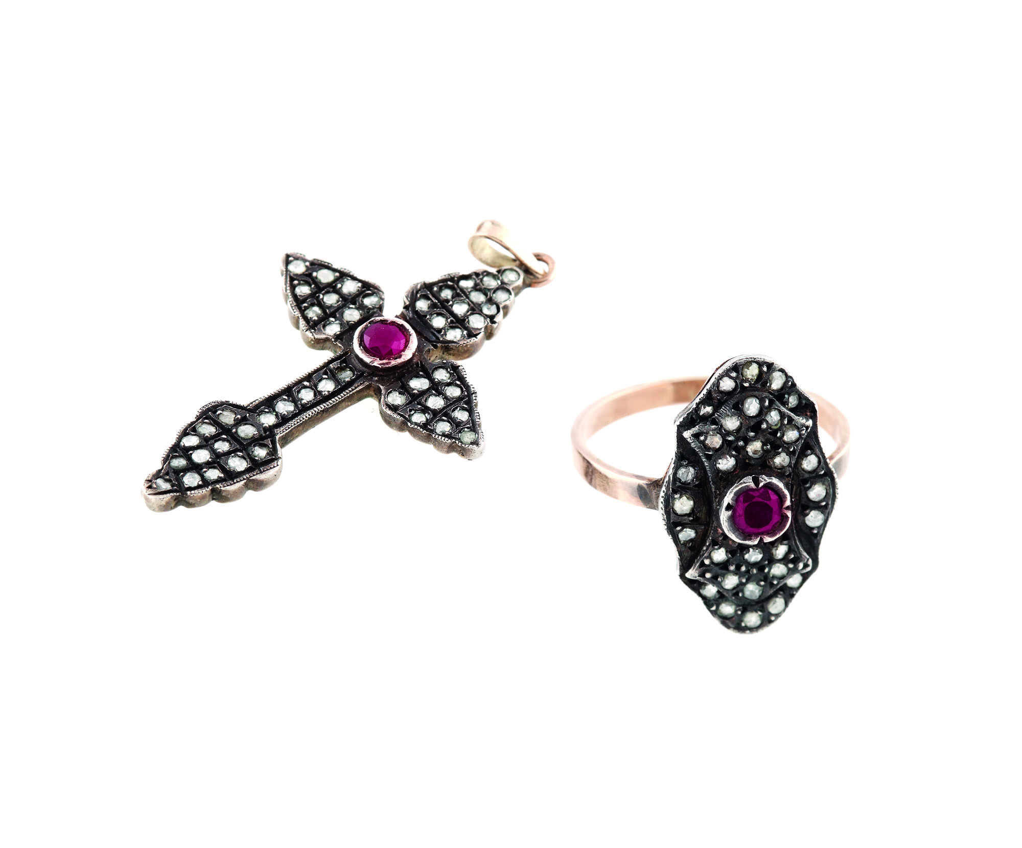 495. Set format din inel și pandantiv-cruce din aur şi argint, ornat cu diamante și rubine