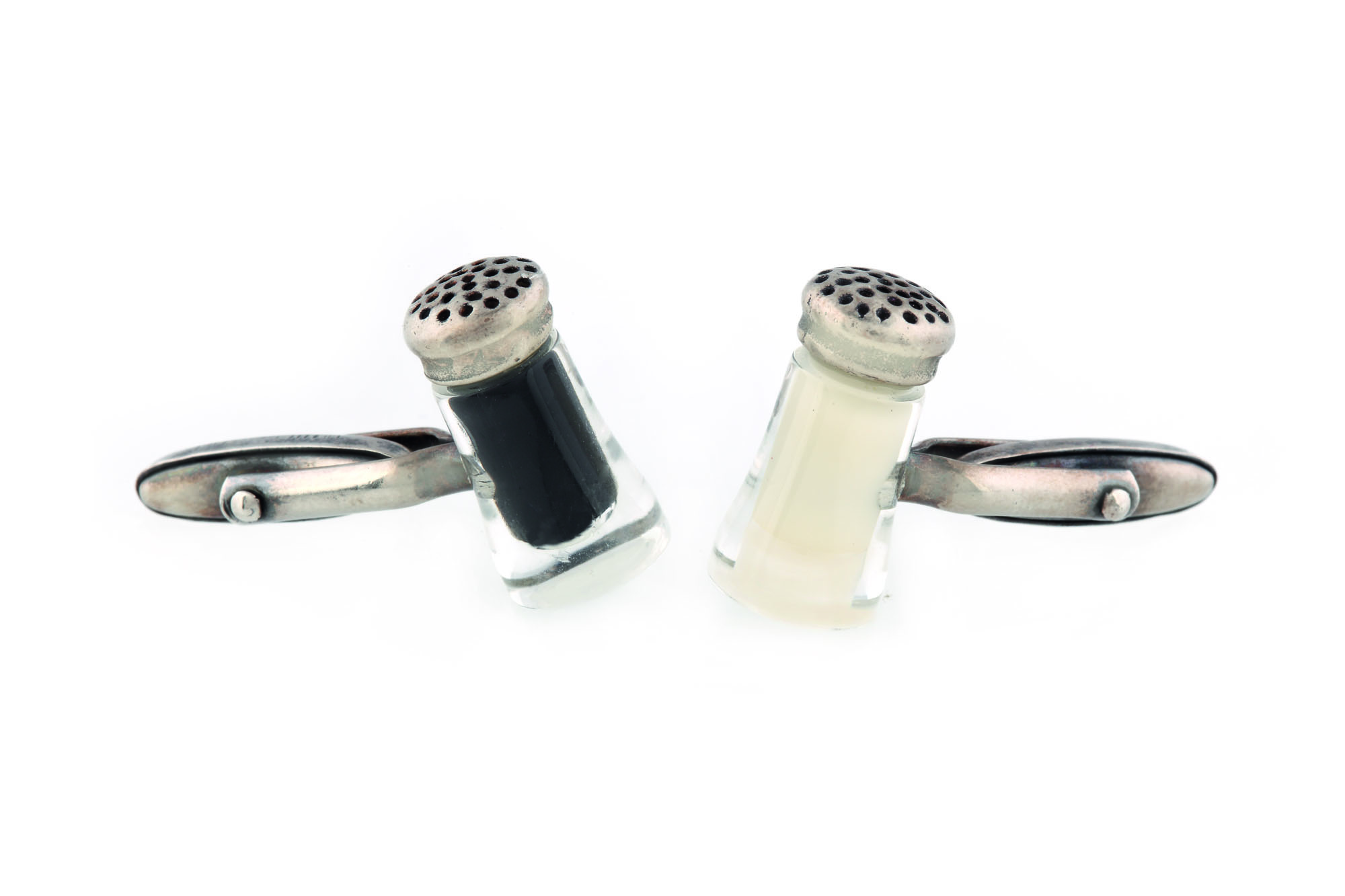 340. Simpatică pereche de butoni din argint, în formă de recipiente pentru sare şi piper
