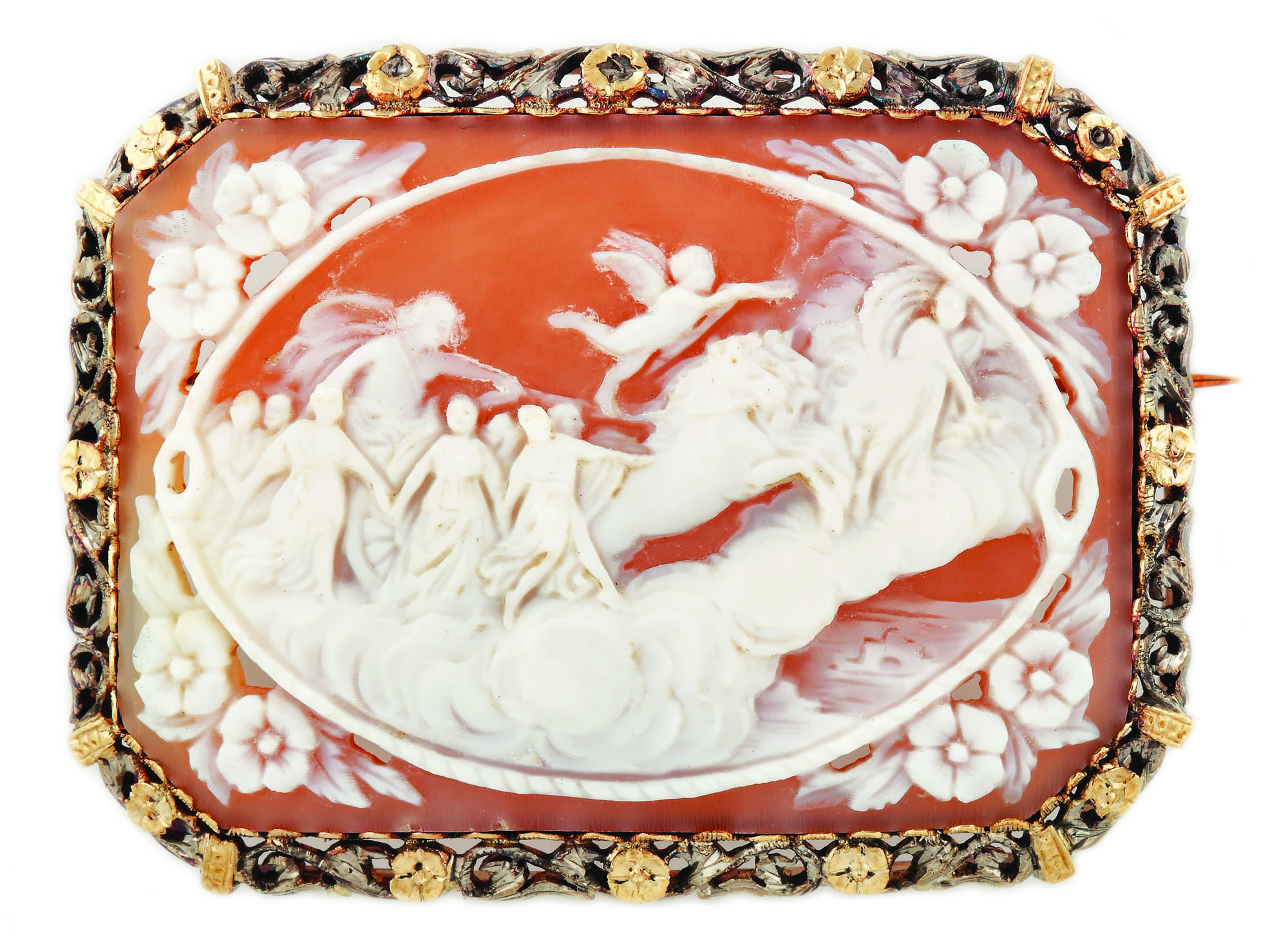 357. Splendidă broşă din aur, cu scenă mitologică sculptată în camee