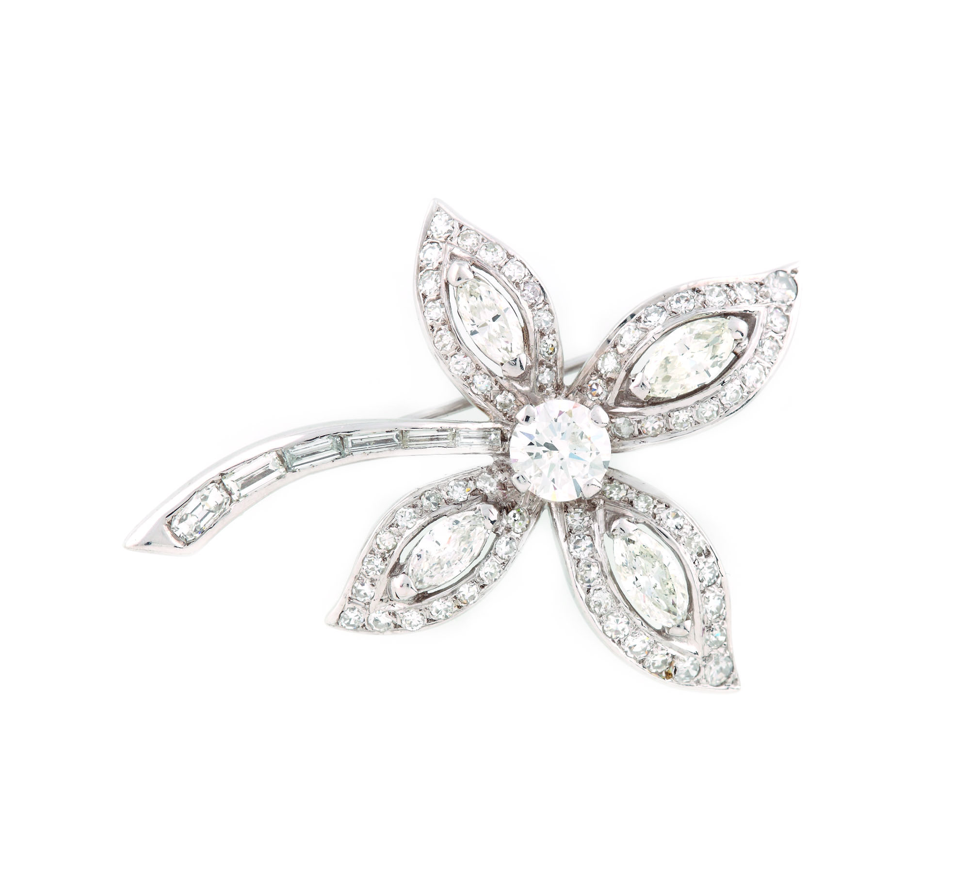 1 diamant rotund briliant carataj 0,85 ct, culoare I-J, claritate I1, 4 diamante marchize faţetate carataj 1.1 ct., culoare I-K, claritate SI2-I1, 62 diamante rotunde single cut cca. 0,6 ct., culoare H-I, claritate VS-SI, 1 diamant emerald cut cca. 0,13 ct., culoare I-K, claritate SI1, 5 diamante ba