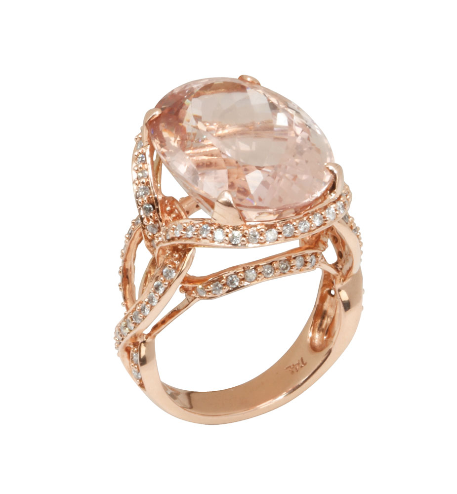 Inel decorativ cu un morganit oval pe o montură înaltă încojurată de un model panglică împletită, pavată cu șir de diamante