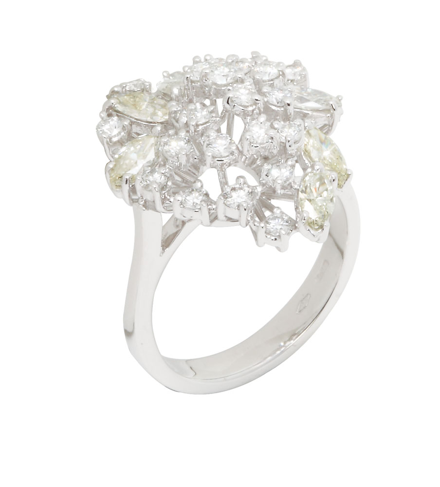 Inel fantezie, creație contemporană, un amestec inventiv de diamante cu tăietură marchiză și diamante rotunde.