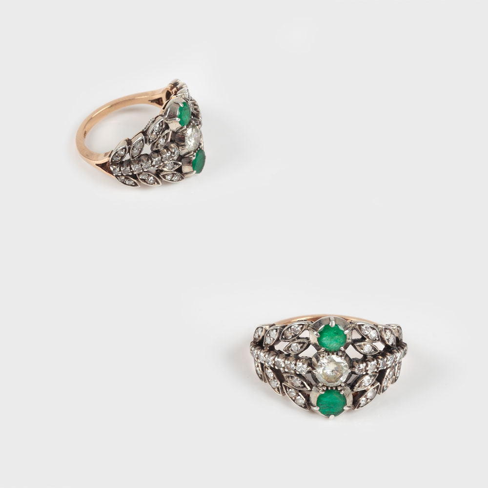 aur galben 18 k și argint 800; 43 diamante cu tăietură simplă briliant cca. 0,77 ct total și 2 smaralde cu tăietură briliant cca. 0,7 ct total; culoare K-L, claritate I1-SI2