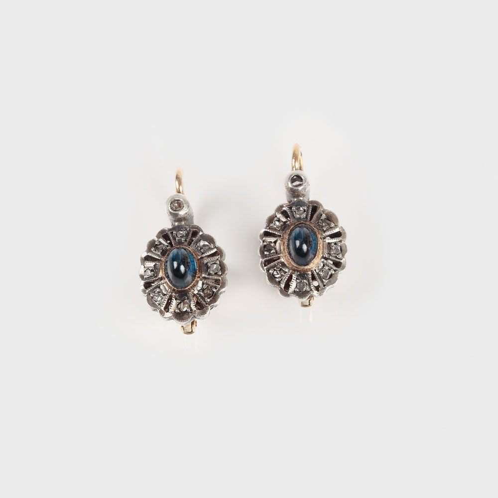 aur galben 14 k; 18 diamante cu tăietură roză cca. 0,09 ct total și 2 safire cu tăietură cabochon oval cca. 0,4 ct total; culoare K-L, claritate I1
