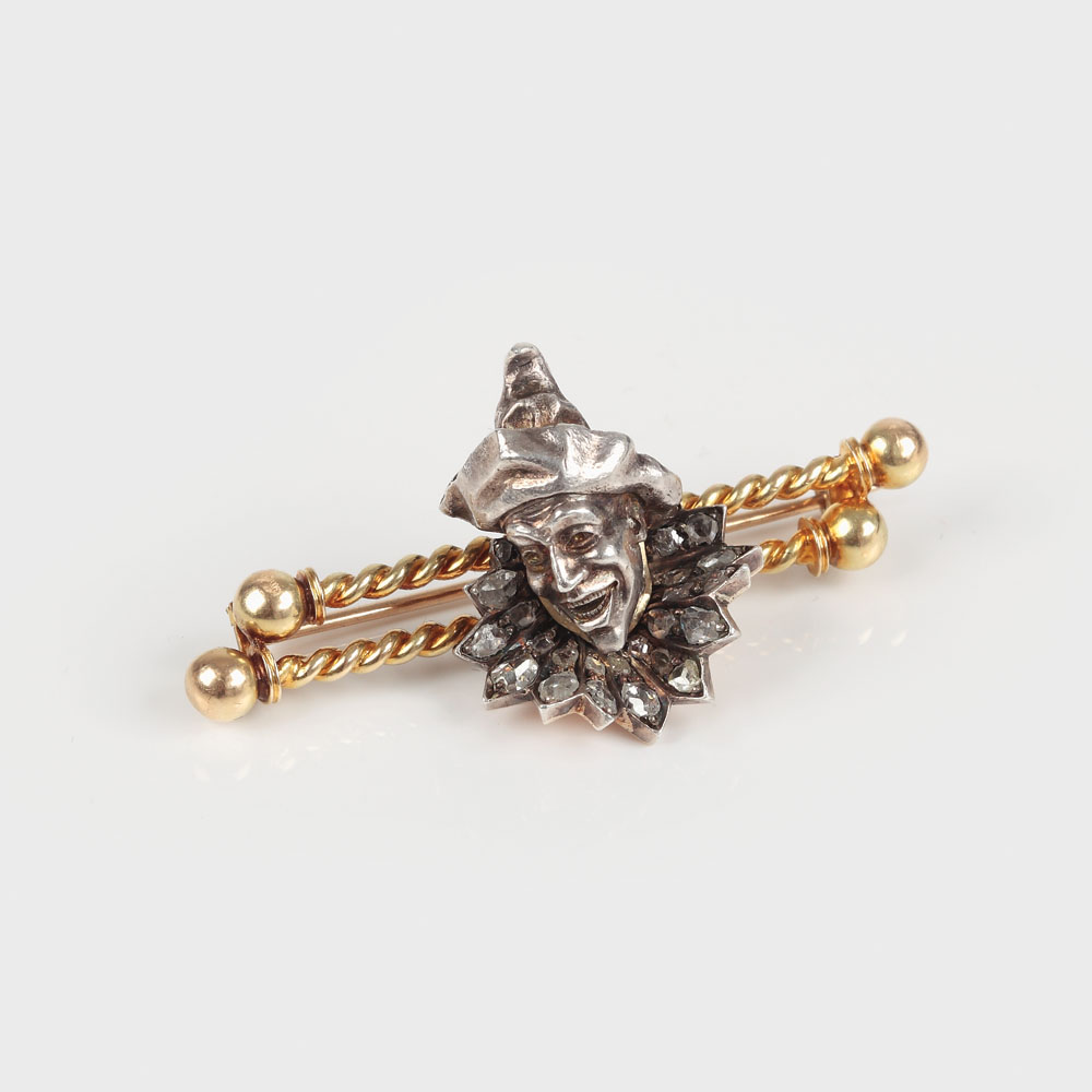 Broșă interesantă, rară, din aur, având forma unui cap de arlechin redat naturalist, cu gulerul bătut în diamante așezat pe două bastoane din recuzita circului, ac simplu de prindere, în cutie originală de fildeș.