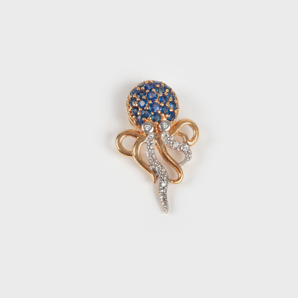 Pandantiv din aur având forma unei caracatițe decorată cu safire și punctată cu câteva mici diamante.